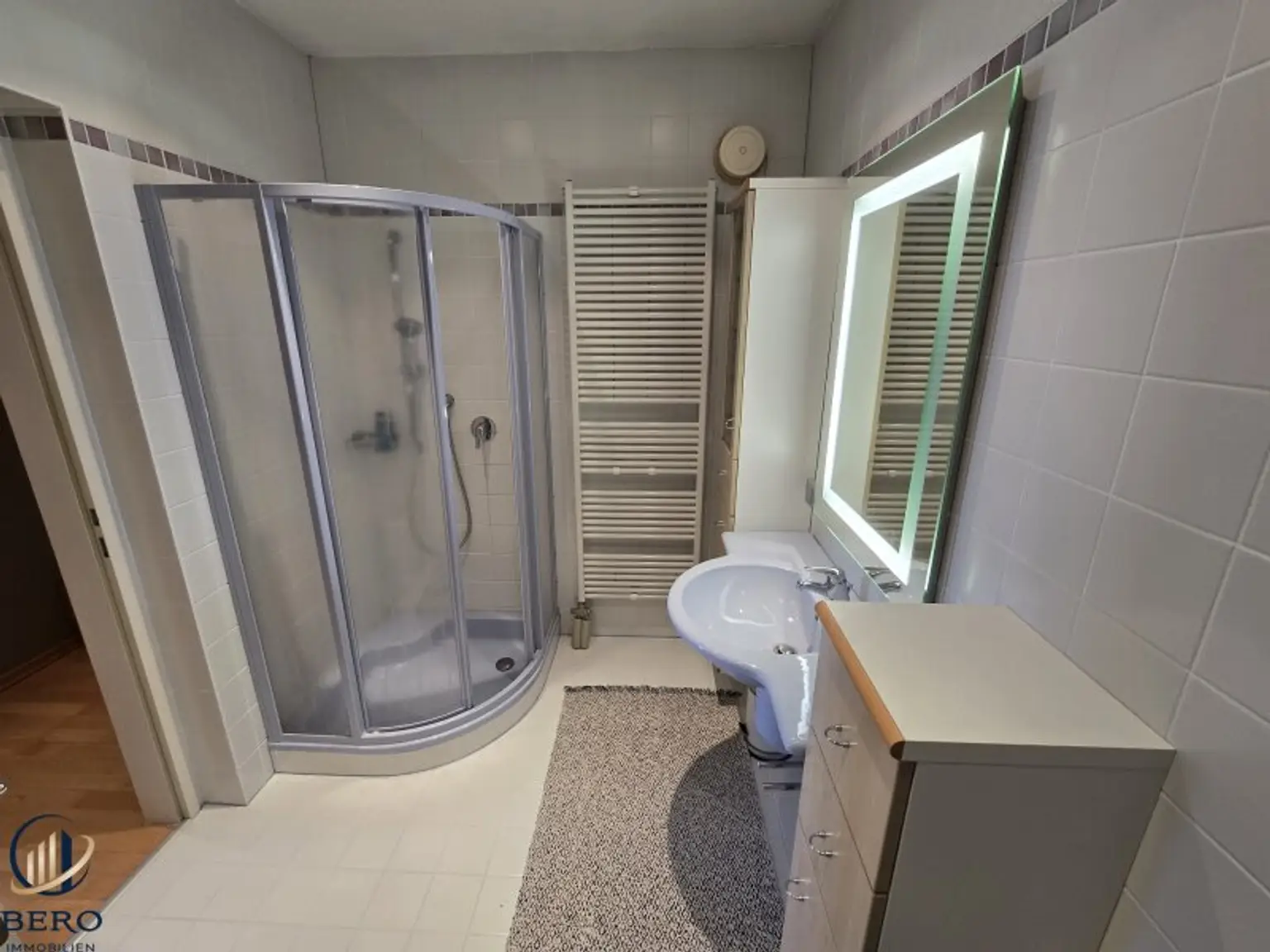 Das moderne Badezimmer verfügt neben der Badewanne auch noch über eine große Dusche.