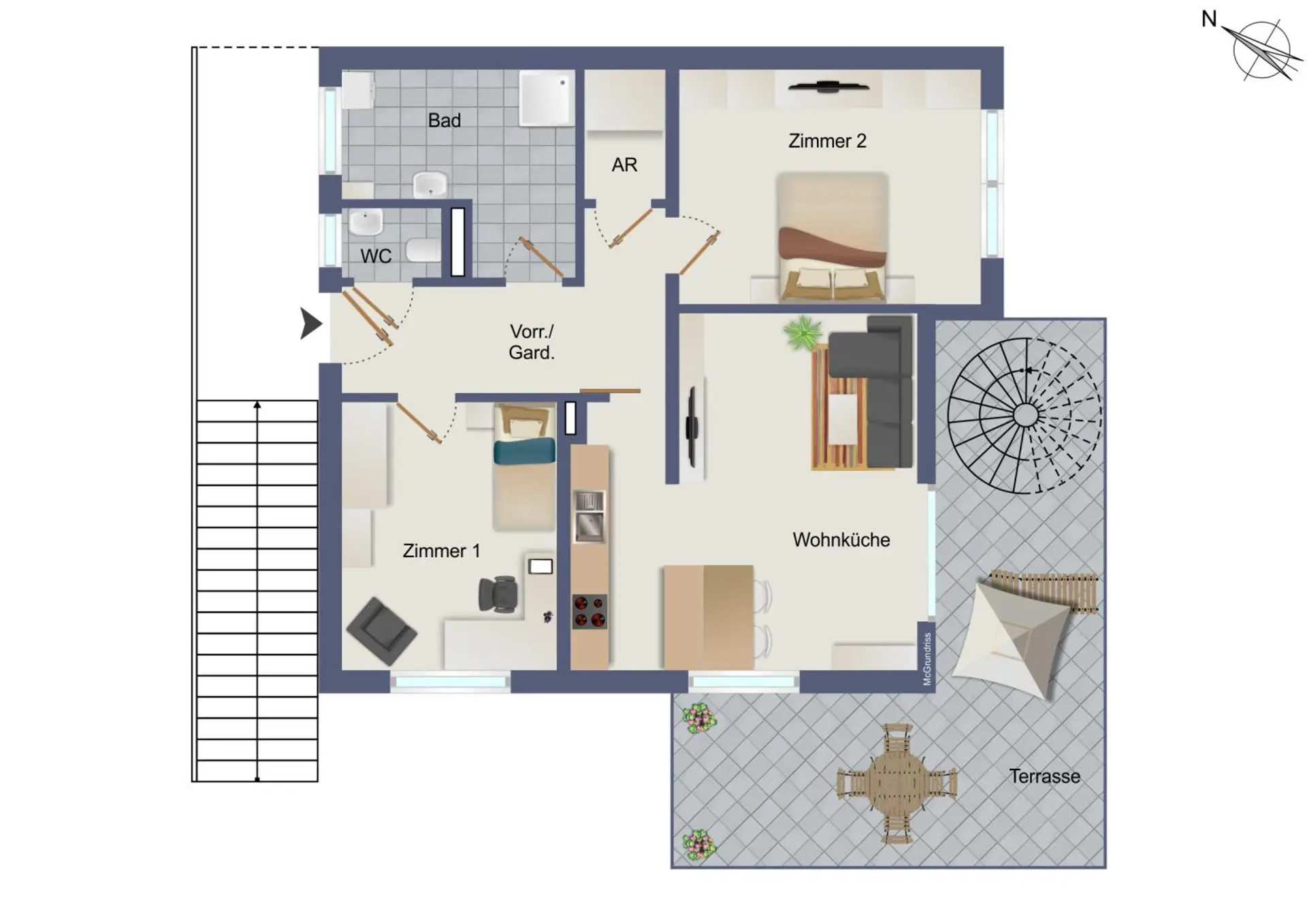 Das Wohnen findet auf einer Ebene statt. Alle Zimmer sind getrennt begehbar. Vom Koch-/Wohn-/Essbereich gelangen Sie auf den sehr großzügigen Süd-Westbalkon. Das Highlight, die ca. 61 m² große Sonnenterrasse, ist vom Balkon aus erreichbar.