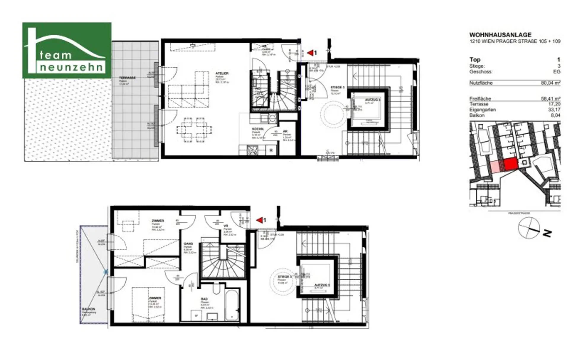 Die 3-Zimmer-Wohnung mit ca. 80,04 m² Wohnfläche sowie mit ca. 17,20 m² Terrasse, ca. 33,17 m² Eigengarten und ca. 8,04 m² Balkon befindet sich im Erdgeschoss - 1. Obergeschoss und orientiert sich Richtung Südosten.