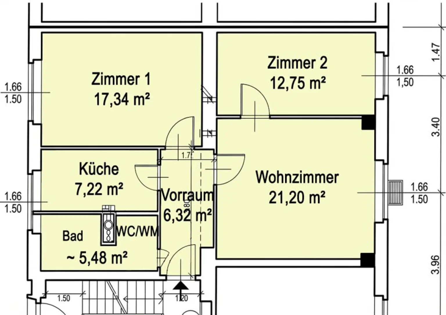 Der ostseitige Wohn-/Essbereich sowie zwei weitere Zimmer (1 Schlafzimmer, 1 Arbeits-, Kinder- oder Gästezimmer) ermöglichen flexible Nutzungsmöglichkeiten. Die separate, westseitig in den Hof ausgerichtete Küche sowie das Bad mit Fenster, Dusche, Spiegelschrank, Waschmaschinenanschluss und Handtuchheizkörper bieten komfortables Wohnen.