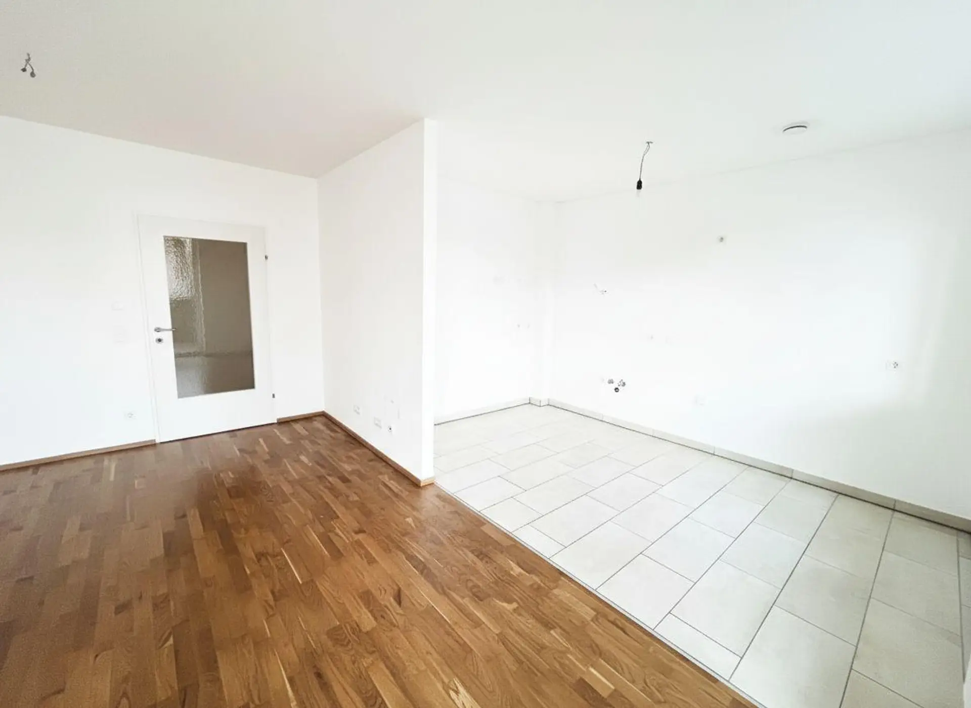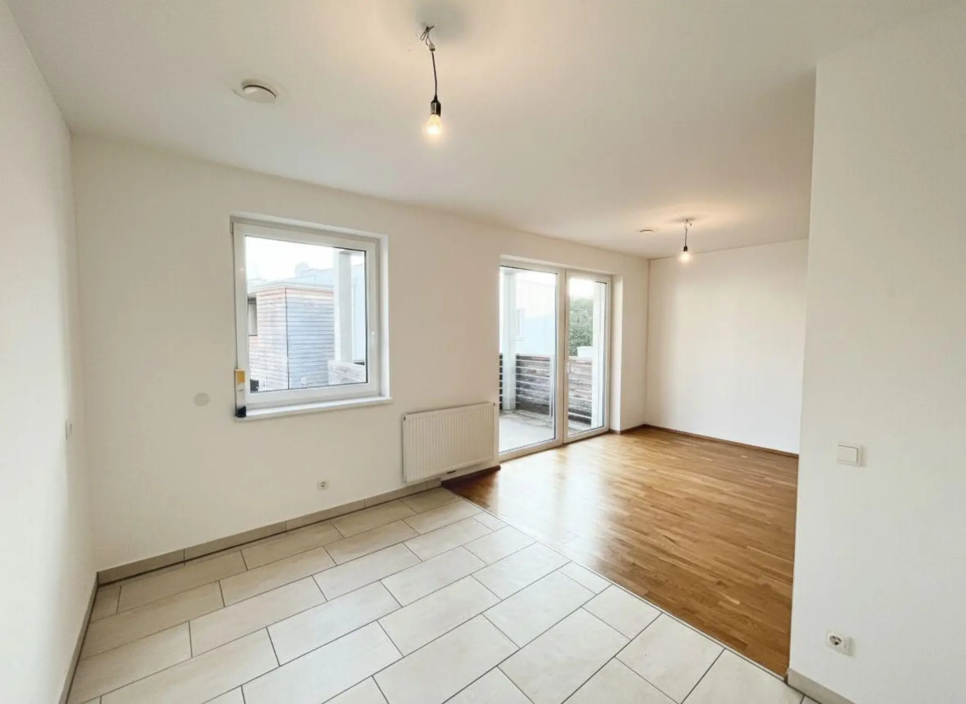 Anschließend gelangen wir in die offene, geräumige Wohn-/Essküche, von der man direkt auf den Balkon gelangen kann.