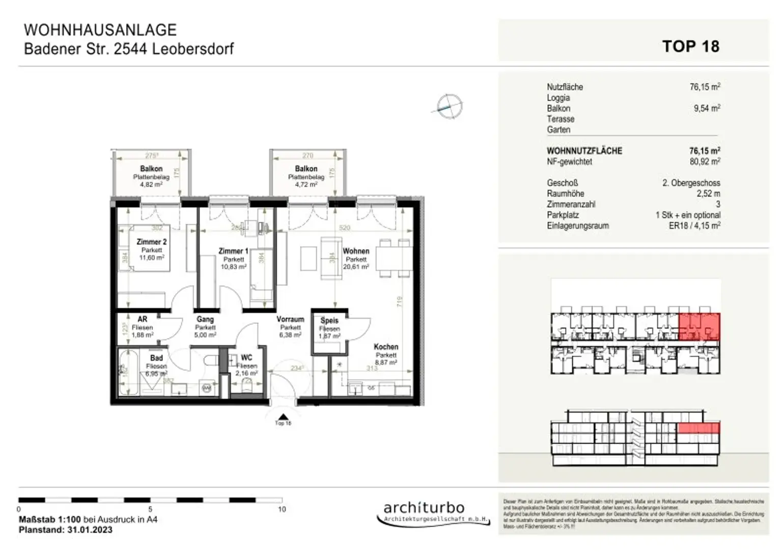 Auf 76,15 m² erwartet dich ein großzügiges 3‑Zimmer‑Apartment, das Raum für Leben, Arbeiten und Wohlfühlen bietet. Zwei Balkone mit insgesamt 9,54 m² erweitern deinen Wohnraum nach draußen. Ein Tiefgaragenplatz ist inkludiert – ein zweiter kann ganz easy dazu gemietet werden.