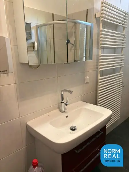 Bad mit Fenster zum Innenhof, Dusche, Waschbecken, Handtuchheizung