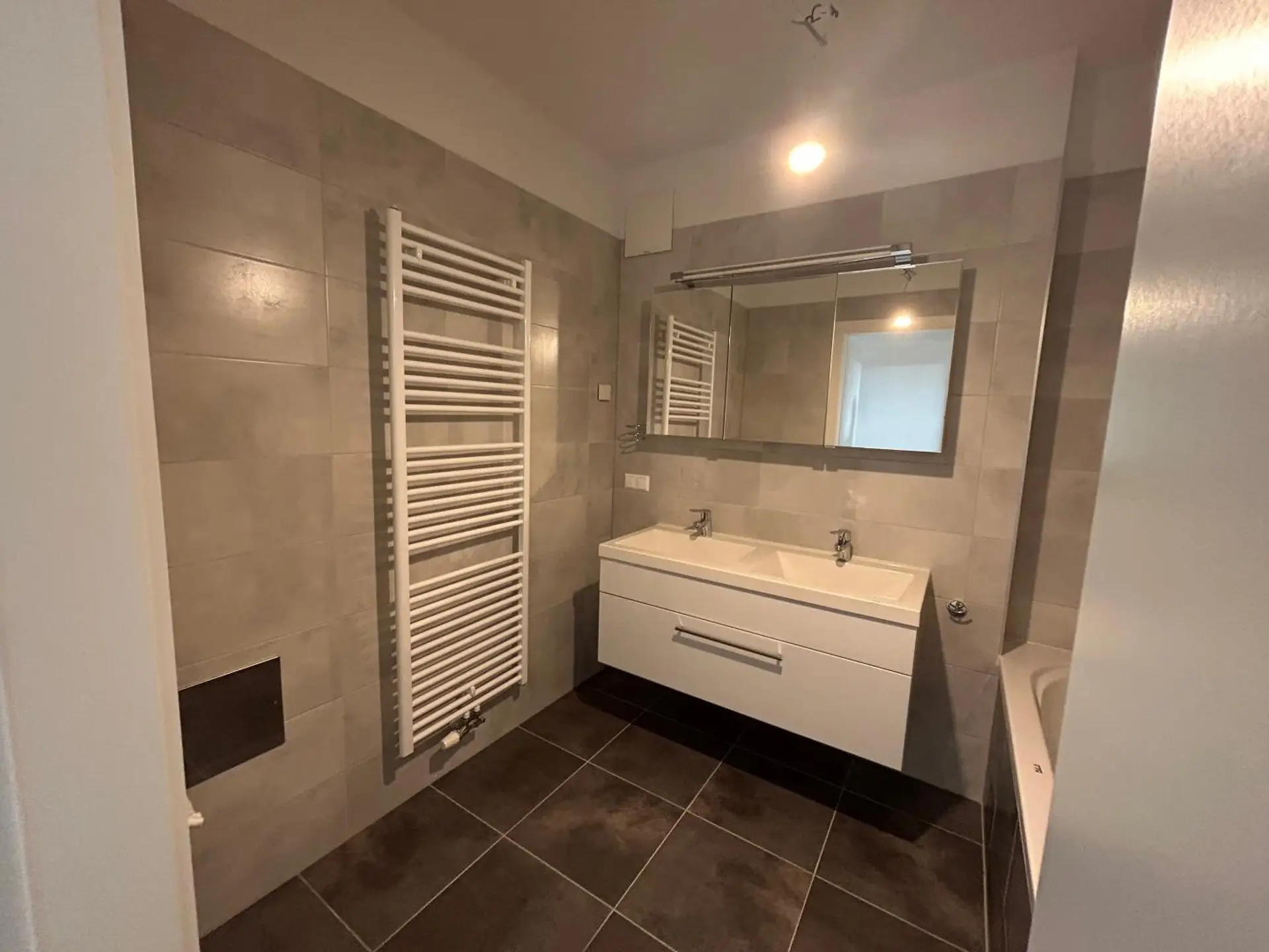 Badezimmer mit Badewanne, Doppelwaschbecken und Waschmaschinenanschluss