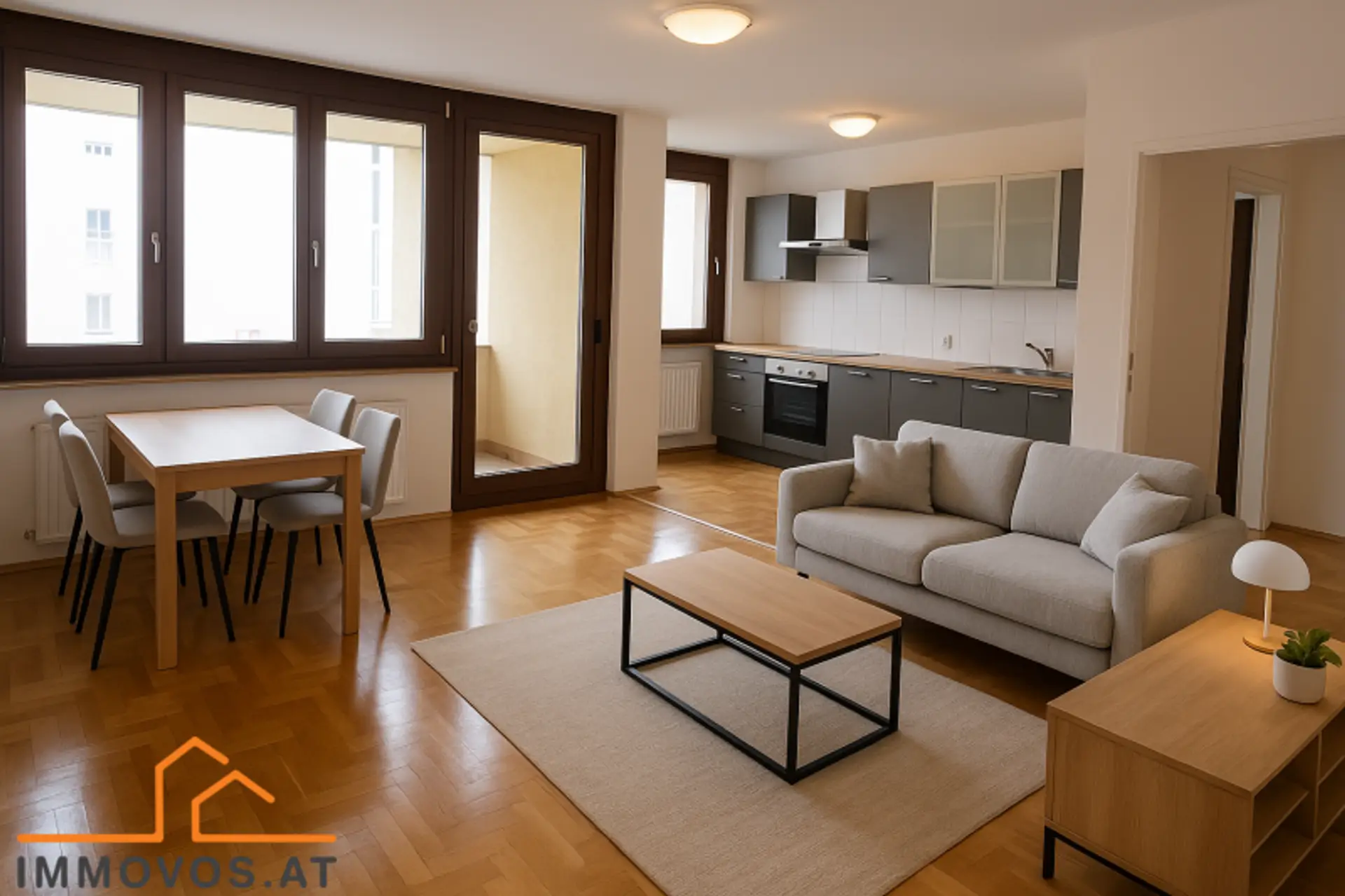 Der offen gestaltete Wohnbereich mit integrierter, voll ausgestatteter Küche bildet das Zentrum der Wohnung. Von hier aus gelangt man auf die rund 5 m² große Loggia, die zusätzlichen Erholungsraum bietet.