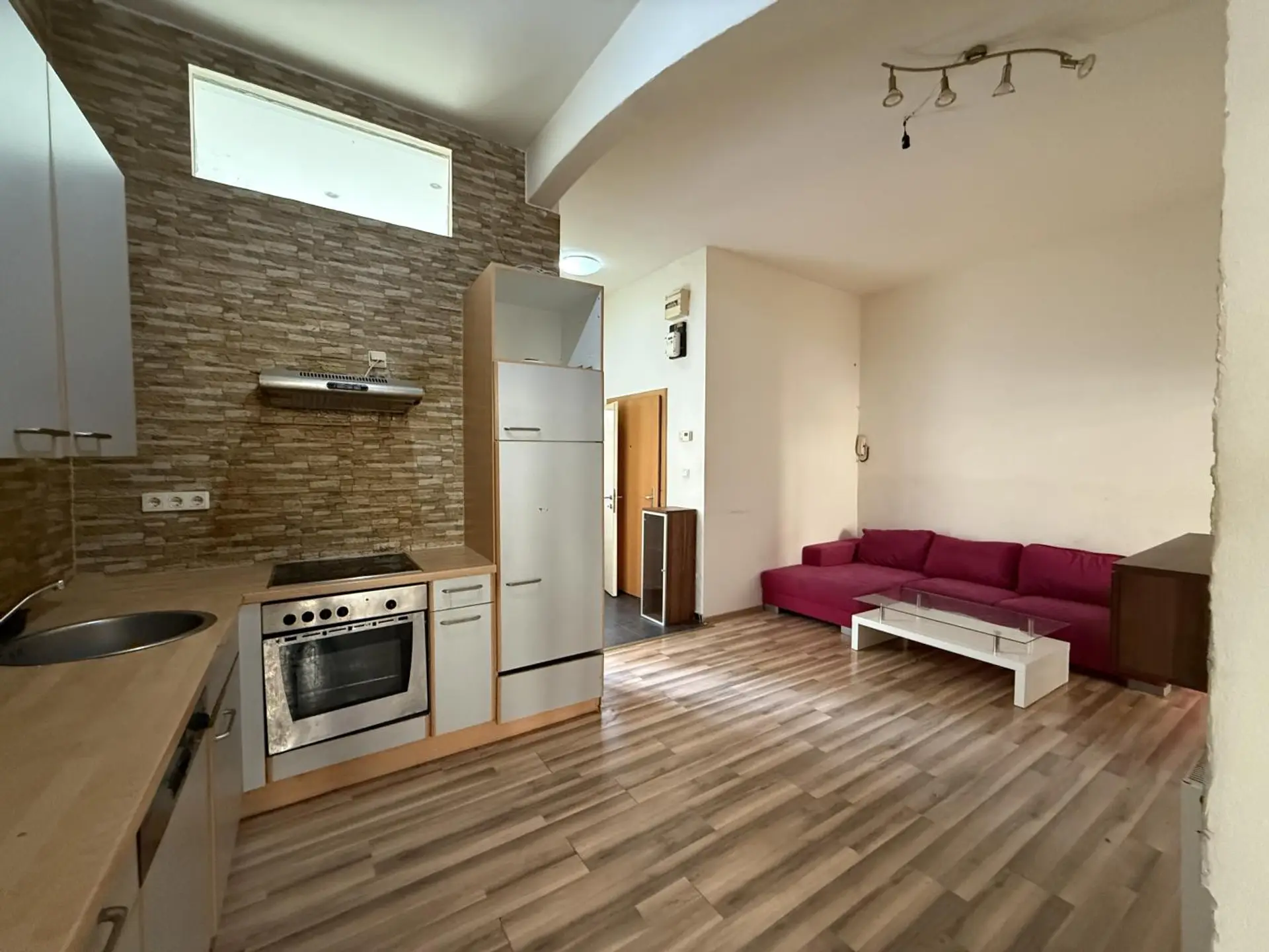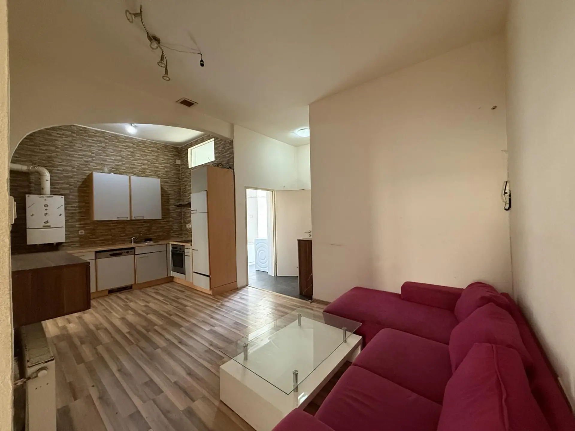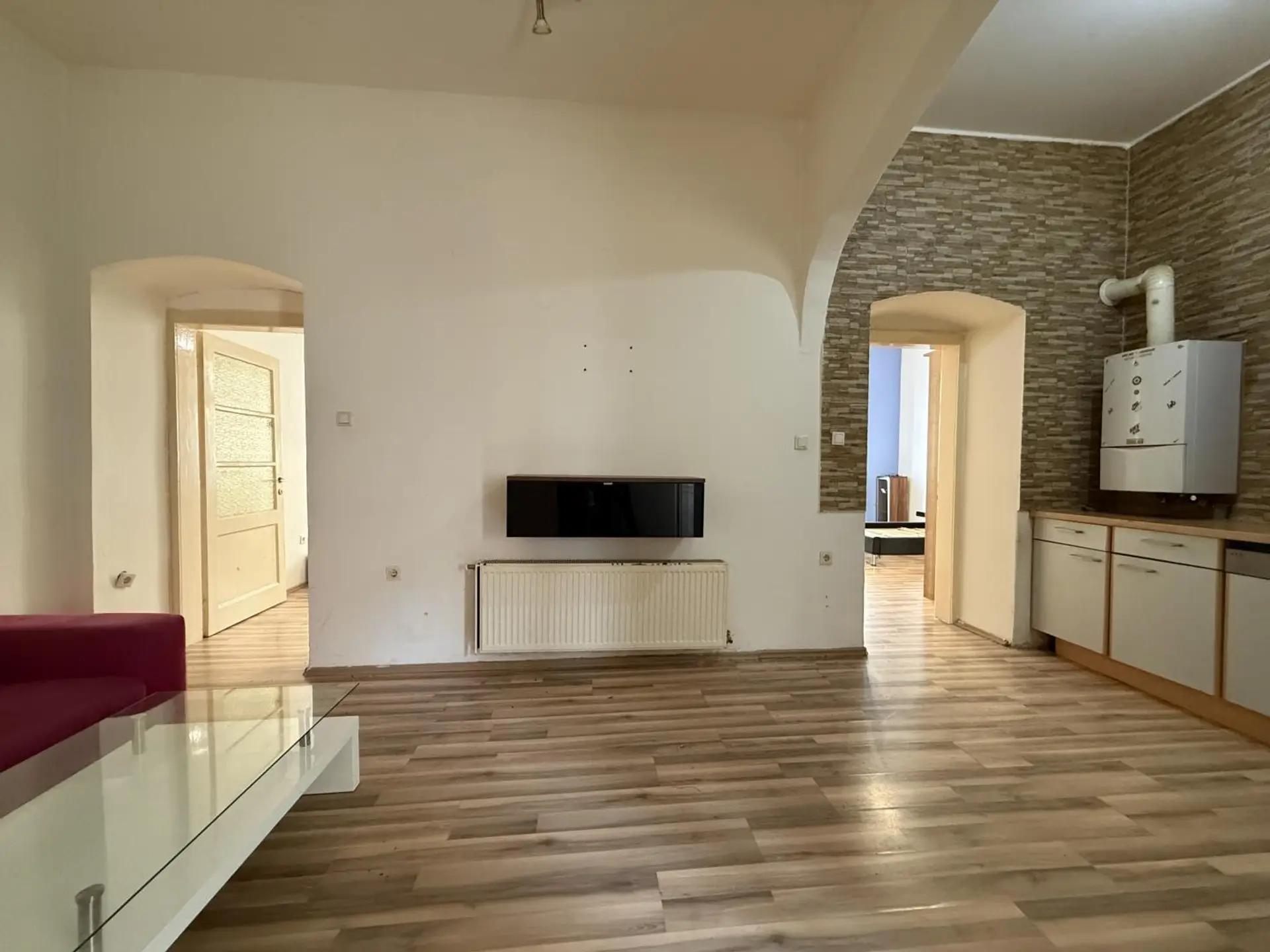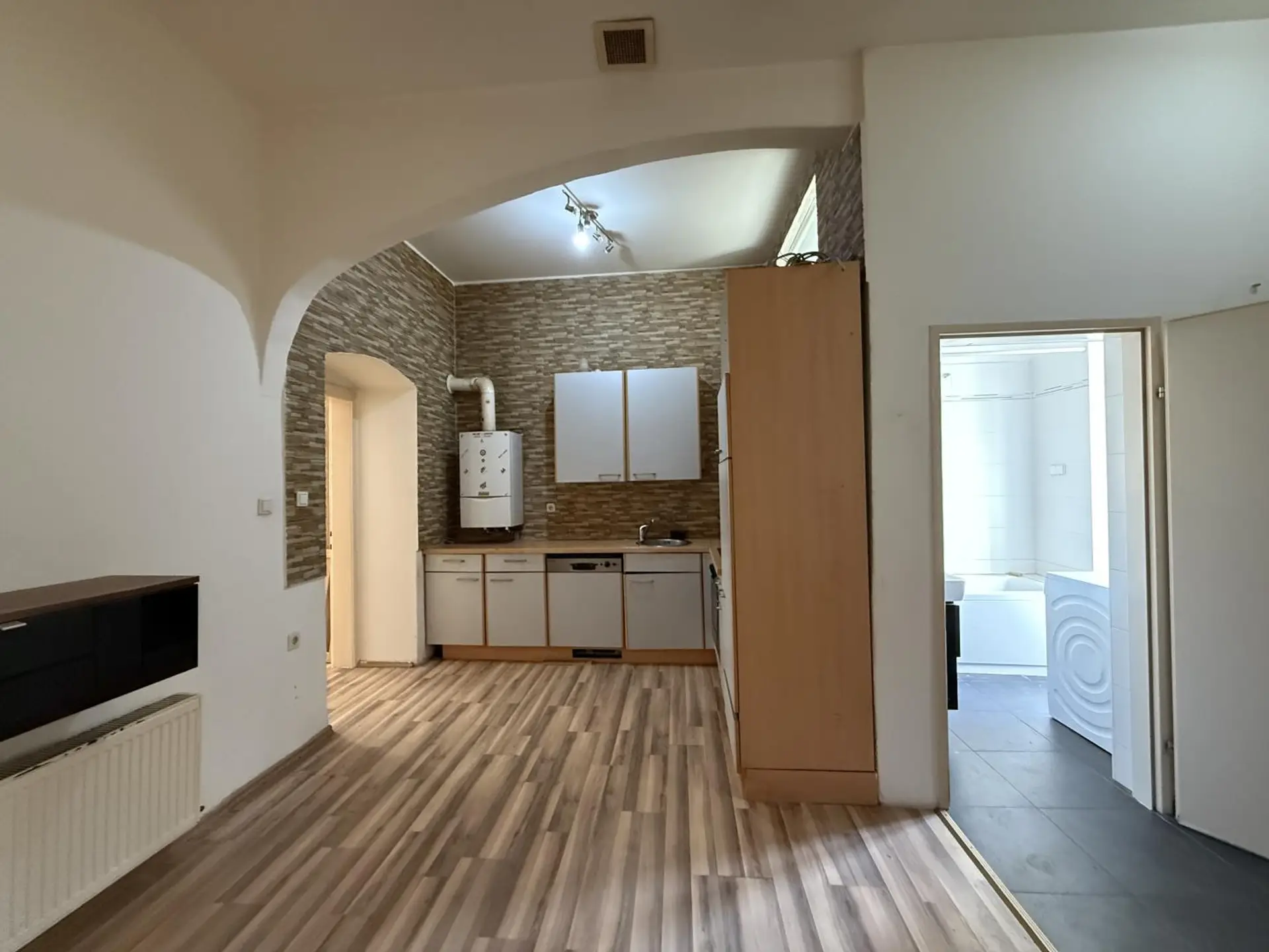 Der zentrale Wohnbereich ist als Wohnküche gestaltet und bietet ausreichend Platz für einen Wohn- und Essbereich.