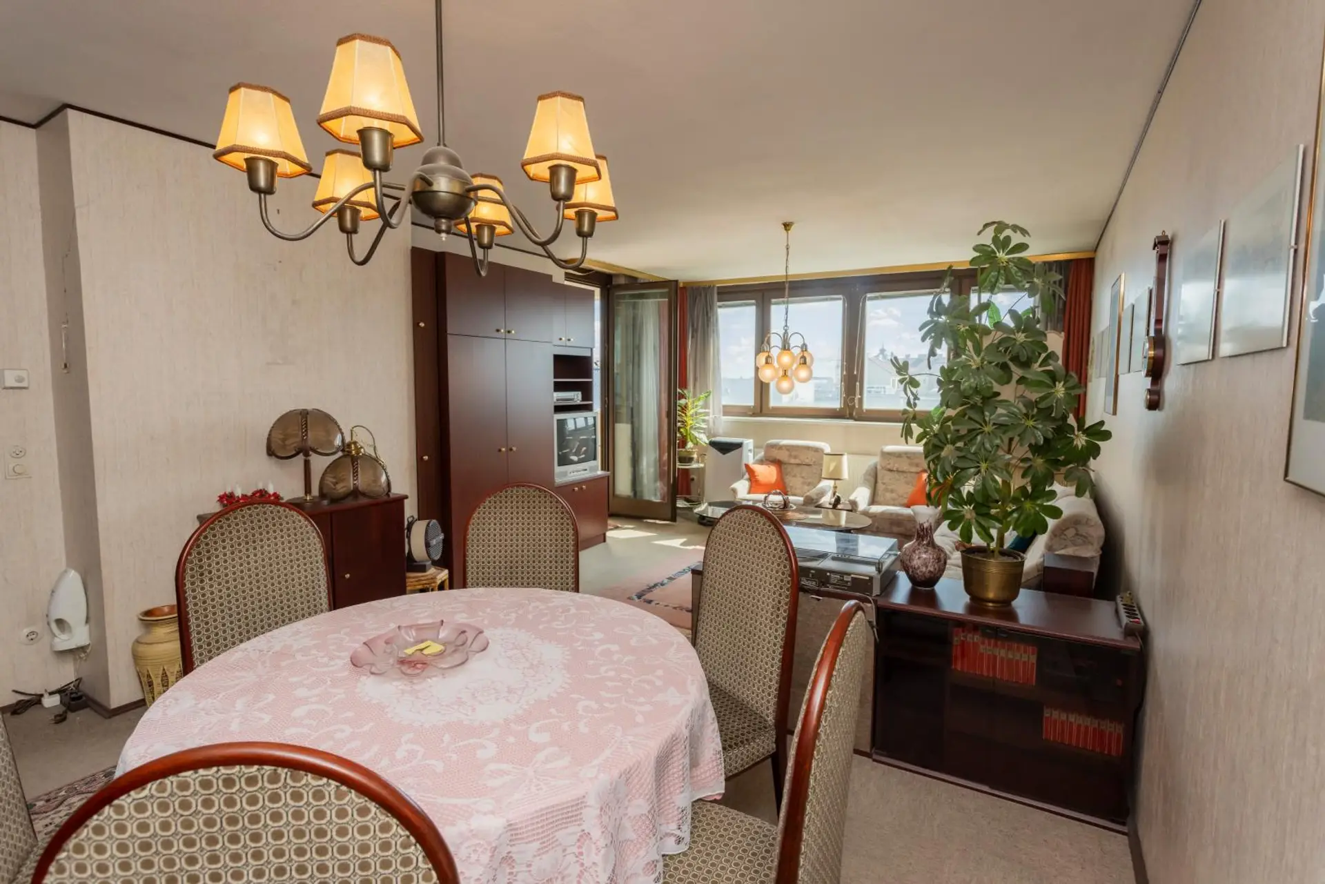 Herzstück ist das weitläufige Wohnzimmer (ca. 30 m²) mit direktem Ausgang auf die Loggia – ideal für Wohnen, Essen & Homeoffice. Die separate Küche (Retro‑Charme; viel Stauraum, Doppelspüle) befindet sich gleich neben dem Wohnbereich.