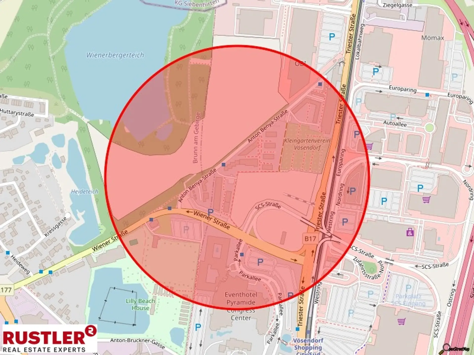Pyramidenblick Lage und Infrastruktur: Die hervorragende Lage garantiert optimale Erreichbarkeit: In nur 7 Gehminuten erreichen Sie die Badner Bahn, ebenso besteht eine schnelle Anbindung an die B17 sowie den Autobahnknoten Brunn am Gebirge. Ein umfassendes Mobilitätsangebot mit Car-Sharing, Leihfahrrädern, Fahrradservicestation und öffentlichen E-Ladestationen ergänzt den modernen Wohnkomfort ideal.Für Freizeit und Erholung stehen zahlreiche Angebote in unmittelbarer Nähe zur Verfügung – darunter ein Badeteich (Lilly Beach), TopGolf, das Fitnesscenter Manhattan, die Eventpyramide sowie der Golf- & Country Club Brunn. Einkaufsmöglichkeiten sind bequem erreichbar – allen voran das nahegelegene Westfield Shopping City Süd mit einem umfangreichen Angebot an Shops, Gastronomie und Unterhaltung.