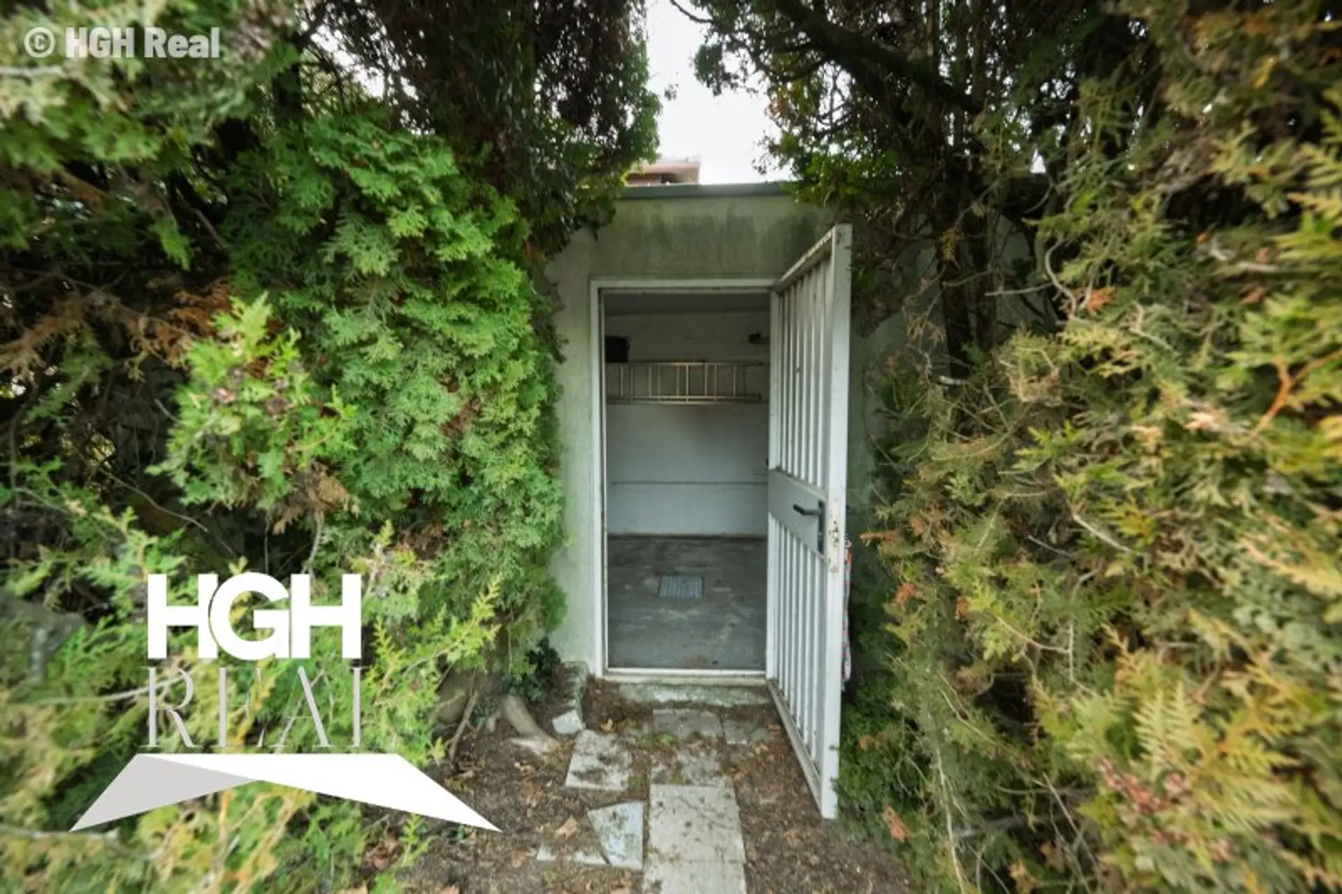 * Großer Holzschuppen im hinteren Teil des Gartens - mit viel Platz für Gartengeräte, Werkzeug oder saisonale Gegenstände.