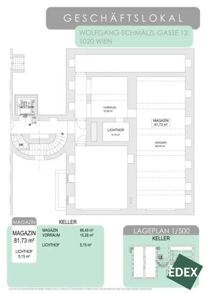 Dieses ca. 82 m² große Magazin befindet sich im Souterrain eines gepflegten Hauses und eignet sich ideal als Werkstätte oder einen anderweitigen Geschäftsbetrieb. Die Immobilie ist über das Stiegenhaus zugänglich.