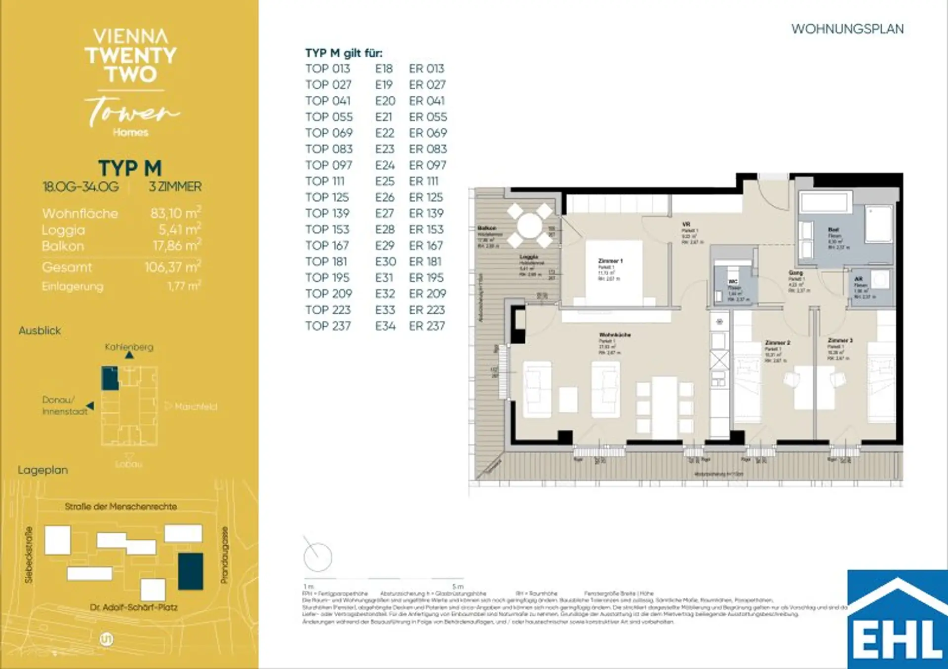 In einzigartiger Lage, direkt bei der U1-Station _Kagran_ und vis-à-vis vom Donau Zentrum, entsteht ein exklusiver, ca. 155m hoher Wohnturm mit 45 Etagen. Die insgesamt 347 Mietwohnungen bieten einen vielfältigen Wohnungsmix: von smart geschnittenen 1,5-Zimmer-Apartments ab ca. 38 m² über komfortable 2-Zimmer-Wohnungen bis hin zu großzügigen 3- und 4-Zimmerwohnungen mit bis zu ca. 80 m².