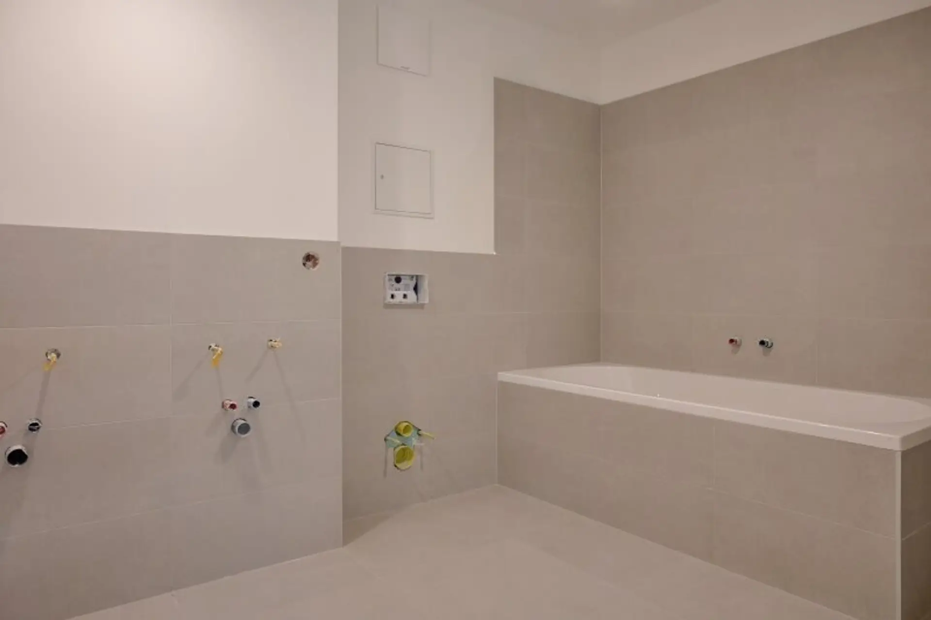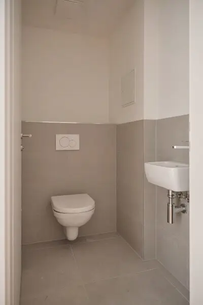 Das moderne Badezimmer mit Wanne, Doppelwaschbecken und WC sowie das separate WC sind hochwertig ausgestattet. Ein praktischer Abstellraum und die vorgelagerte Garderobe runden das Platzangebot ab.