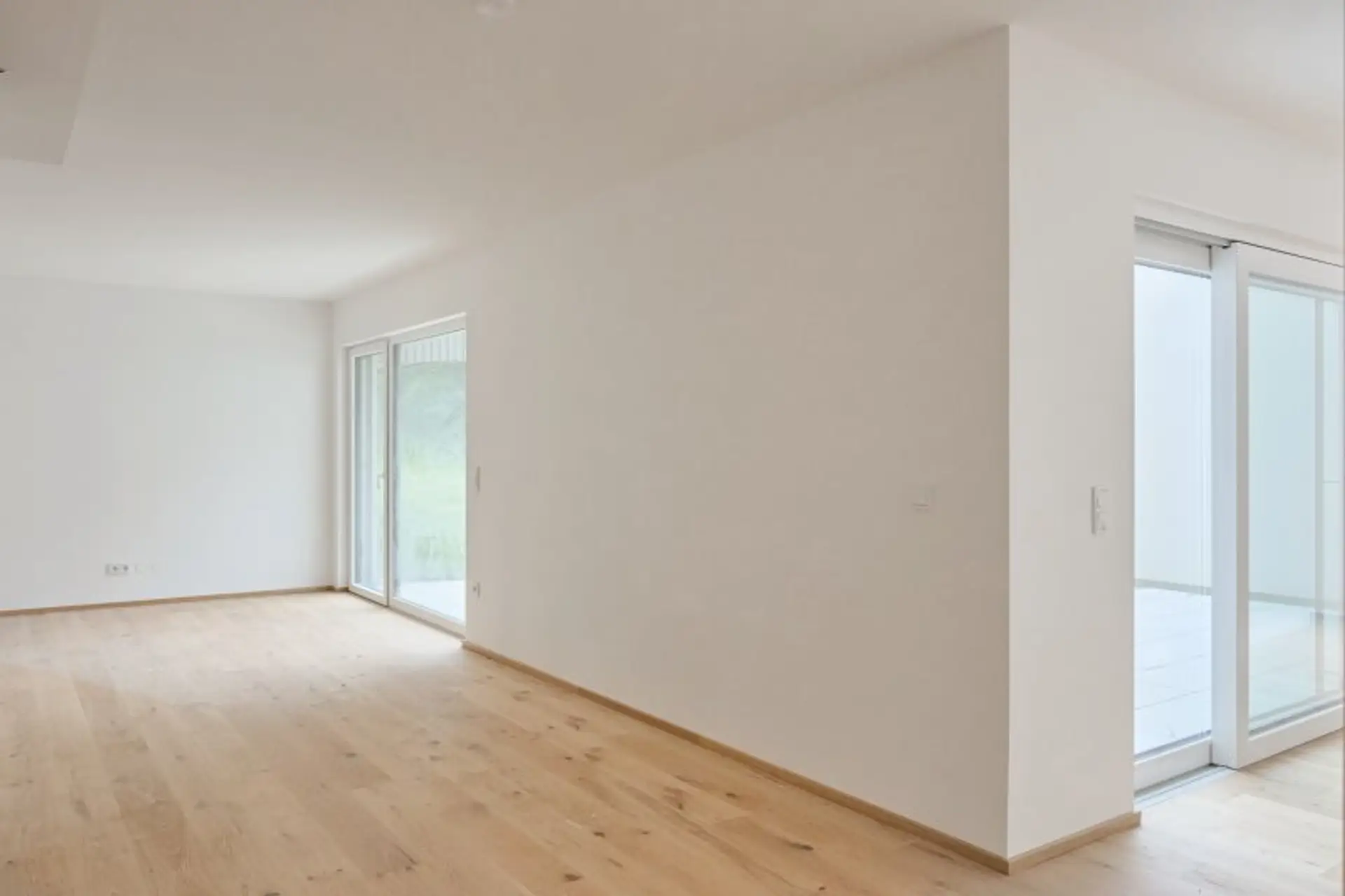 Die 4 Zimmer Gartenwohnung mit etwa 102m² Wohnfläche bietet eine ideale Raumaufteilung für modernes Wohnen. Der offen gestaltete Wohnbereich (etwa 50m²) teilt sich in eine Wohnküche mit Essplatz und Ausgang (Schiebetüre) auf die südseitige Terrasse sowie ein Wohnzimmer.