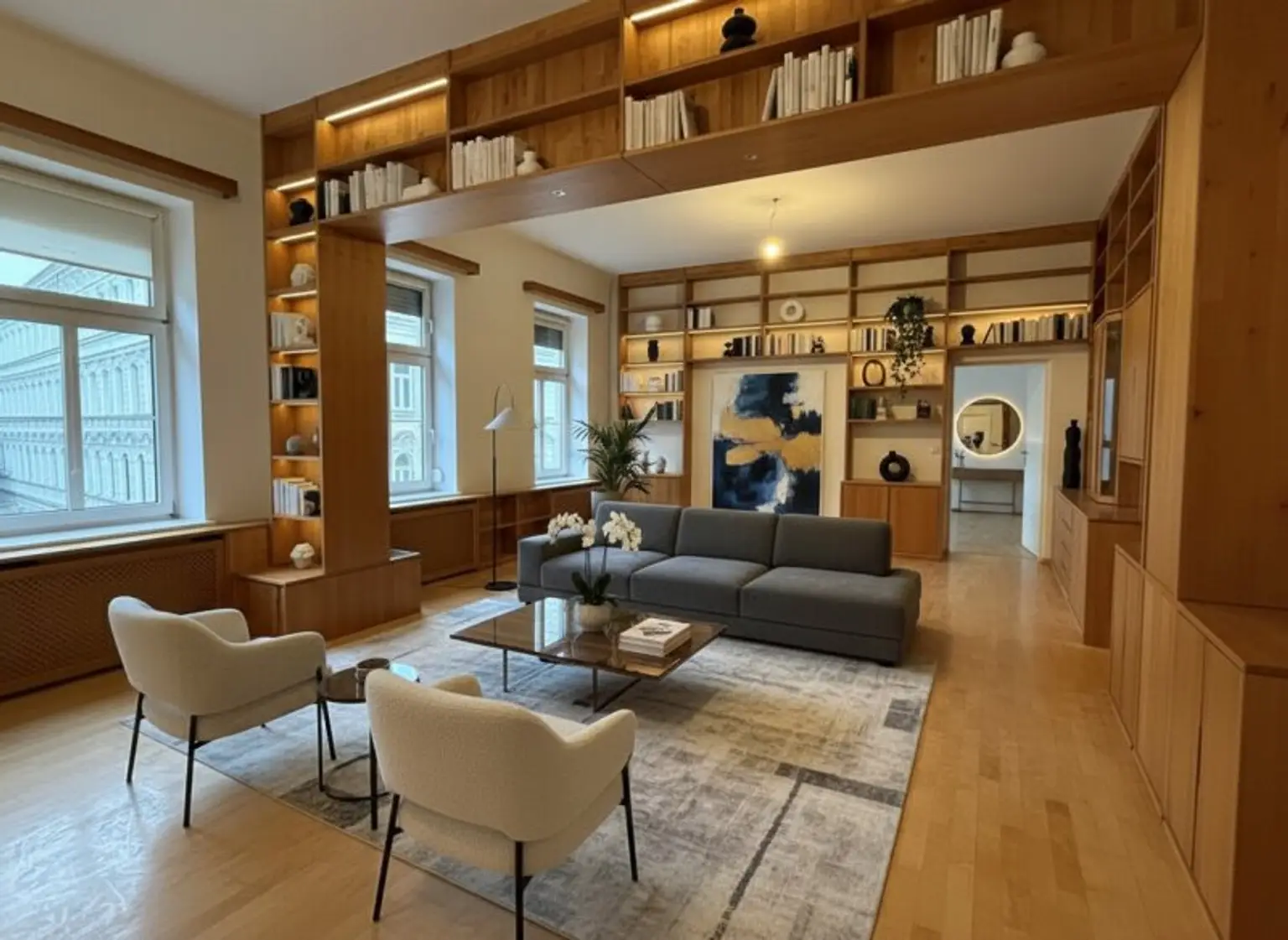 Bereits beim Eintreten beeindruckt das offene Raumgefühl: Hohe Decken, edle Parkettböden, maßgefertigte Holzeinbauten und große Fensterflächen schaffen eine helle, wohnliche Atmosphäre mit viel Gestaltungsspielraum.