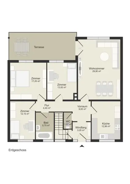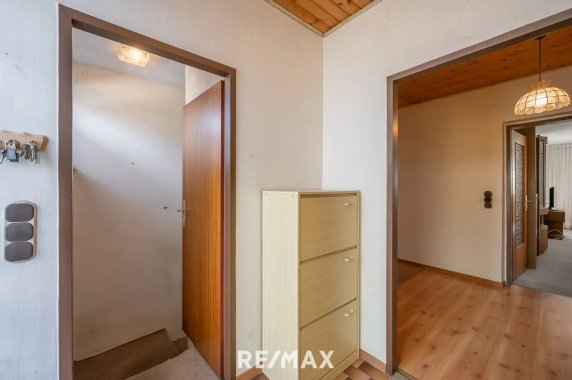 Die Wohnfläche beträgt ca. 109 Quadratmeter und umfasst vier Zimmer in einem praktischen, familienfreundlichen Grundriss mit einem Wohnzimmer, einer Küche, einem Bad, einem WC und drei Schlafzimmern. Die sonnige Terrasse eignet sich ideal für Frühstück im Freien oder den Genuss von Sonnenstunden. Das Haus ist voll unterkellert, was zusätzliche Nutzfläche bietet, eine geräumige Garage für ein Auto und Fahrräder oder ein Motorrad ist vorhanden.