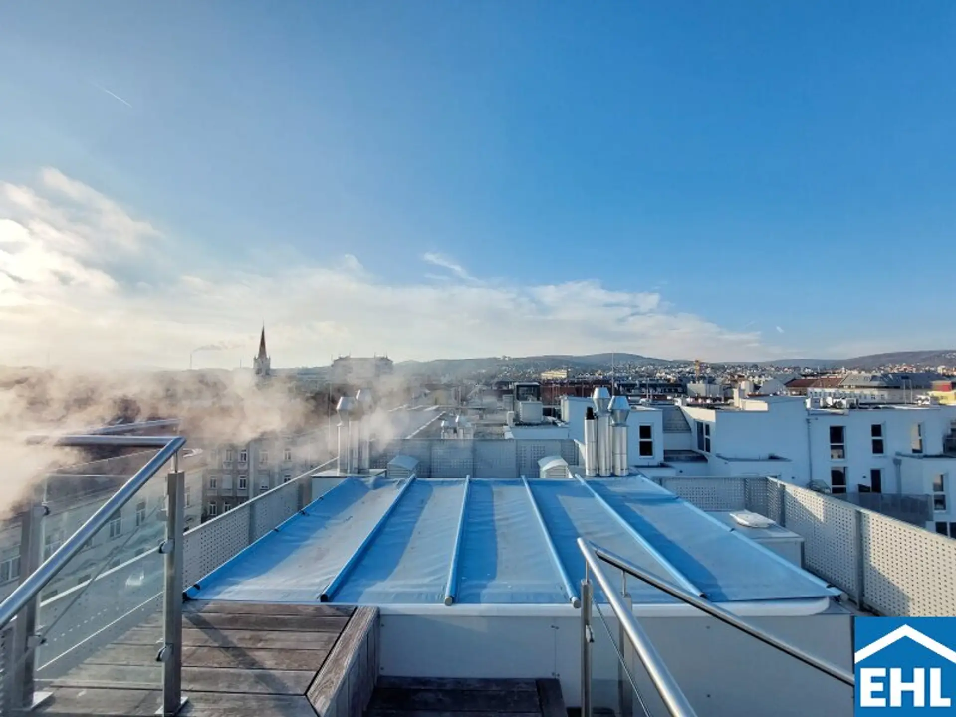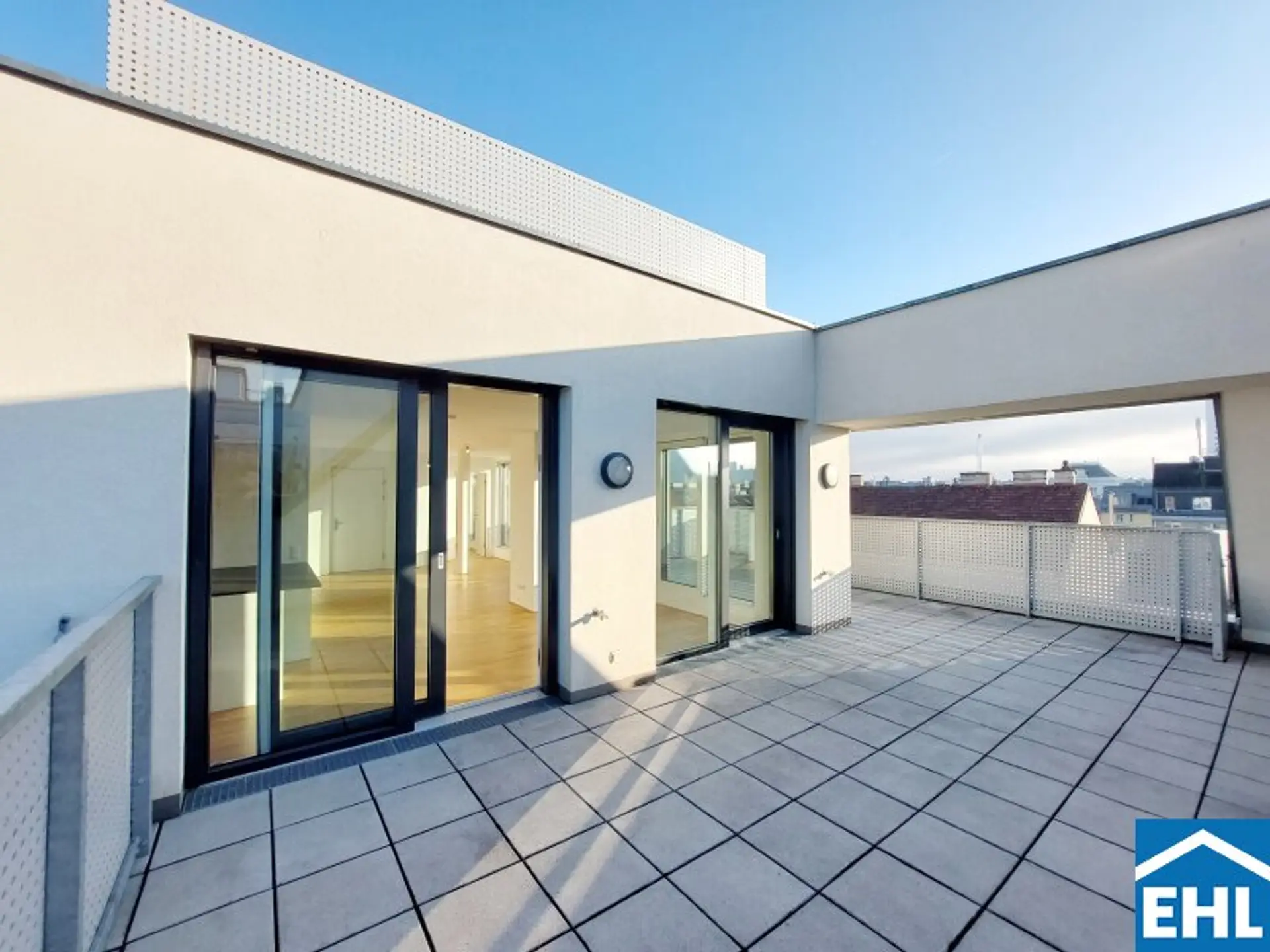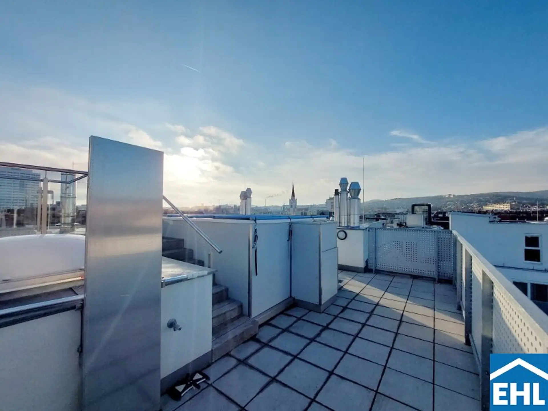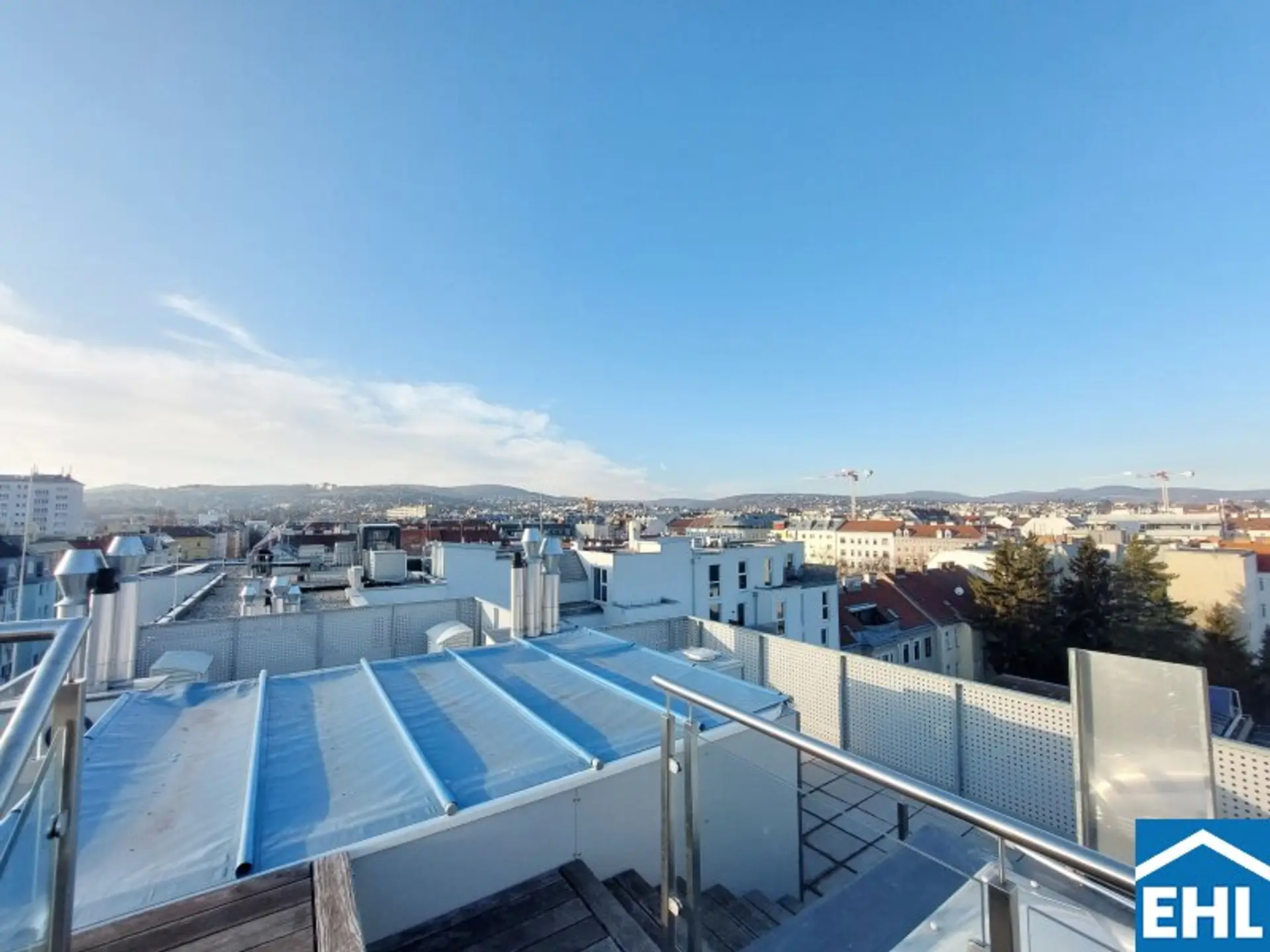 Die Wohnung selbst liegt im 1. und 2. Dachgeschoss und gliedert sich in eine großzügige Wohnküche, drei helle Schlafzimmer, zwei Badezimmer mit Badewanne und Duschen sowie einen Waschmaschinenanschluss und ein WC, eine separate Toilette, sowie einen Vorraum. Der nordseitige Balkon sowie Terrasse, die südseitige Terrasse und die Dachterrasse mit privatem Pool runden das Wohnerlebnis perfekt ab.