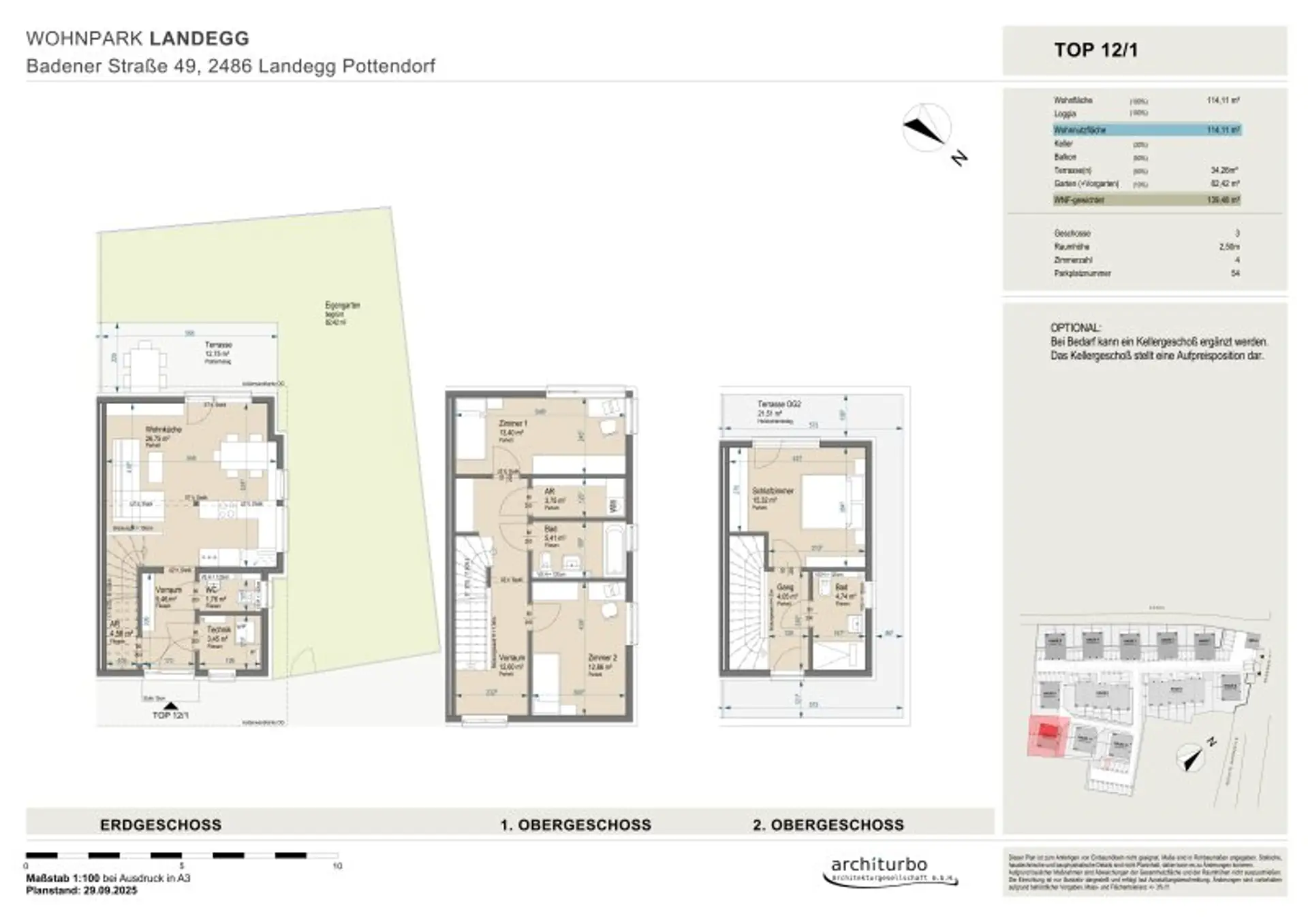 In der dritten Reihe gelegene süd-/westseitig ausgerichtete 3-geschoßige Doppelhaushälfe mit 114 m2 Wohnnutzfläche, 34 m2 Terrassenfläche und 82 m2 Gartenfläche.