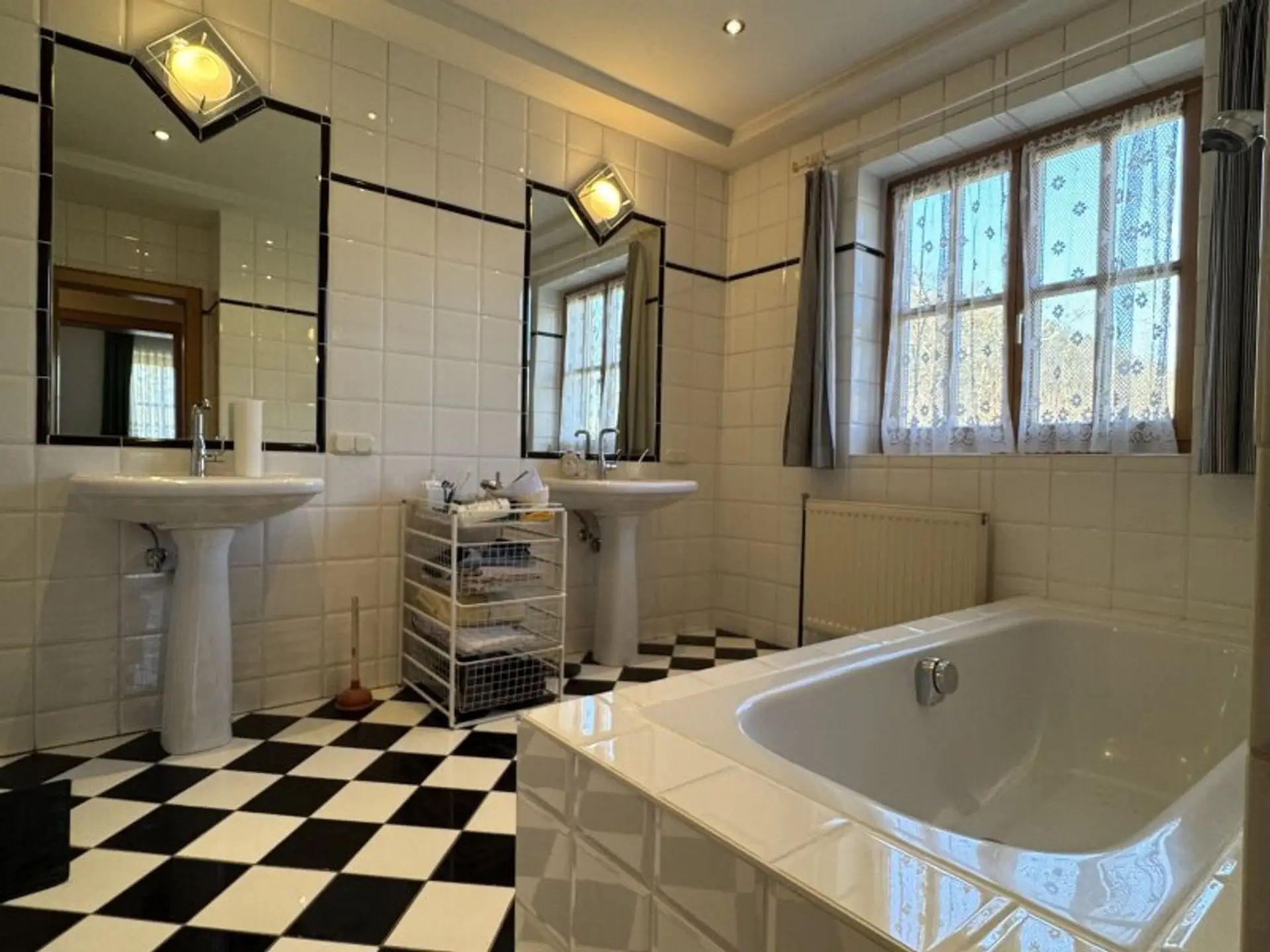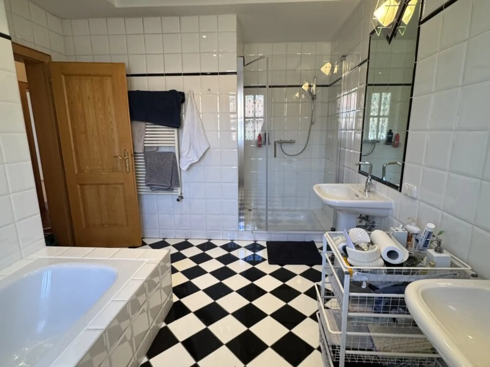 Badezimmer mit Doppelwaschbecken, Badewanne, Dusche und Fenster