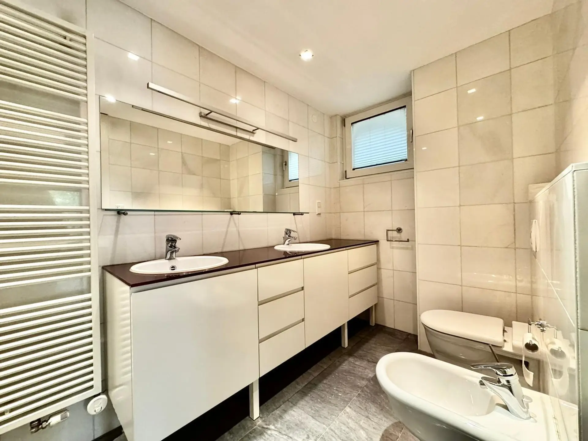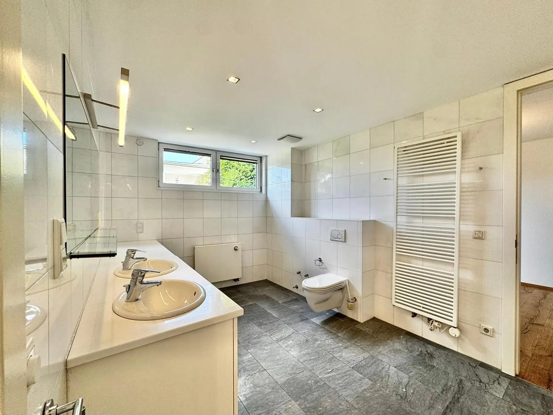 Auf der vom Eingang gesehen rechten Seite der Wohnung finden wir zwei weitere geräumige Zimmer, die durch ein gemeinsames Badezimmer miteinander verbunden sind. Doppelwaschbecken, Badewanne sowie eine separate Duschkabine findet sich hier gleichermaßen wie eine Toilette und der Anschluss für eine Waschmaschine. Das vordere der beiden Zimmer hat ebenfalls einen Ausgang auf die Terrasse und den Garten.