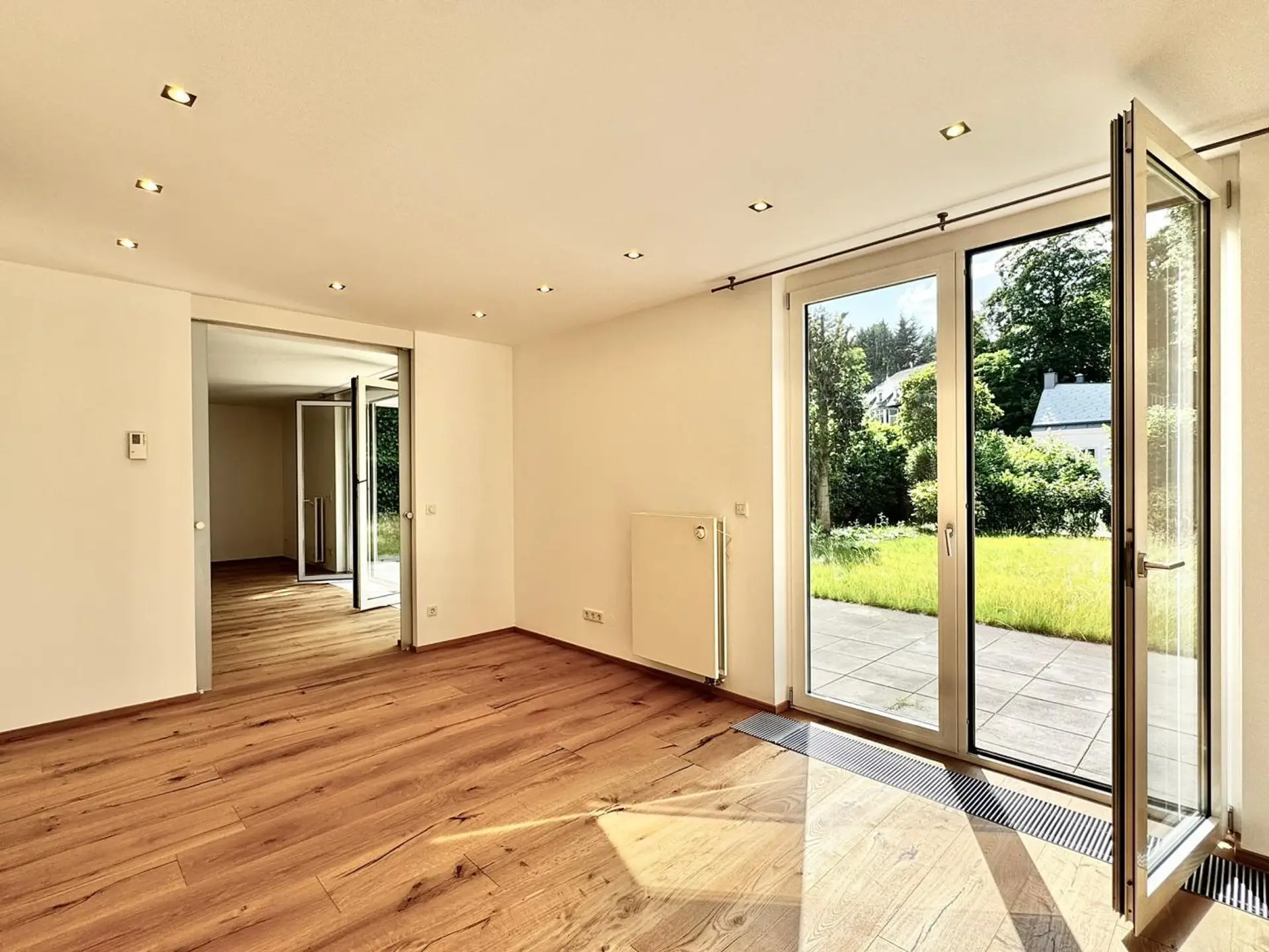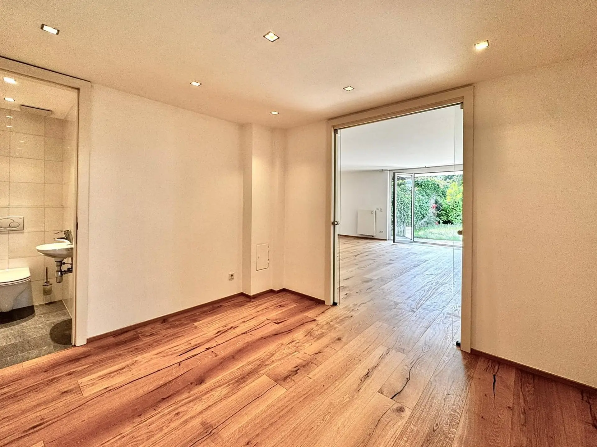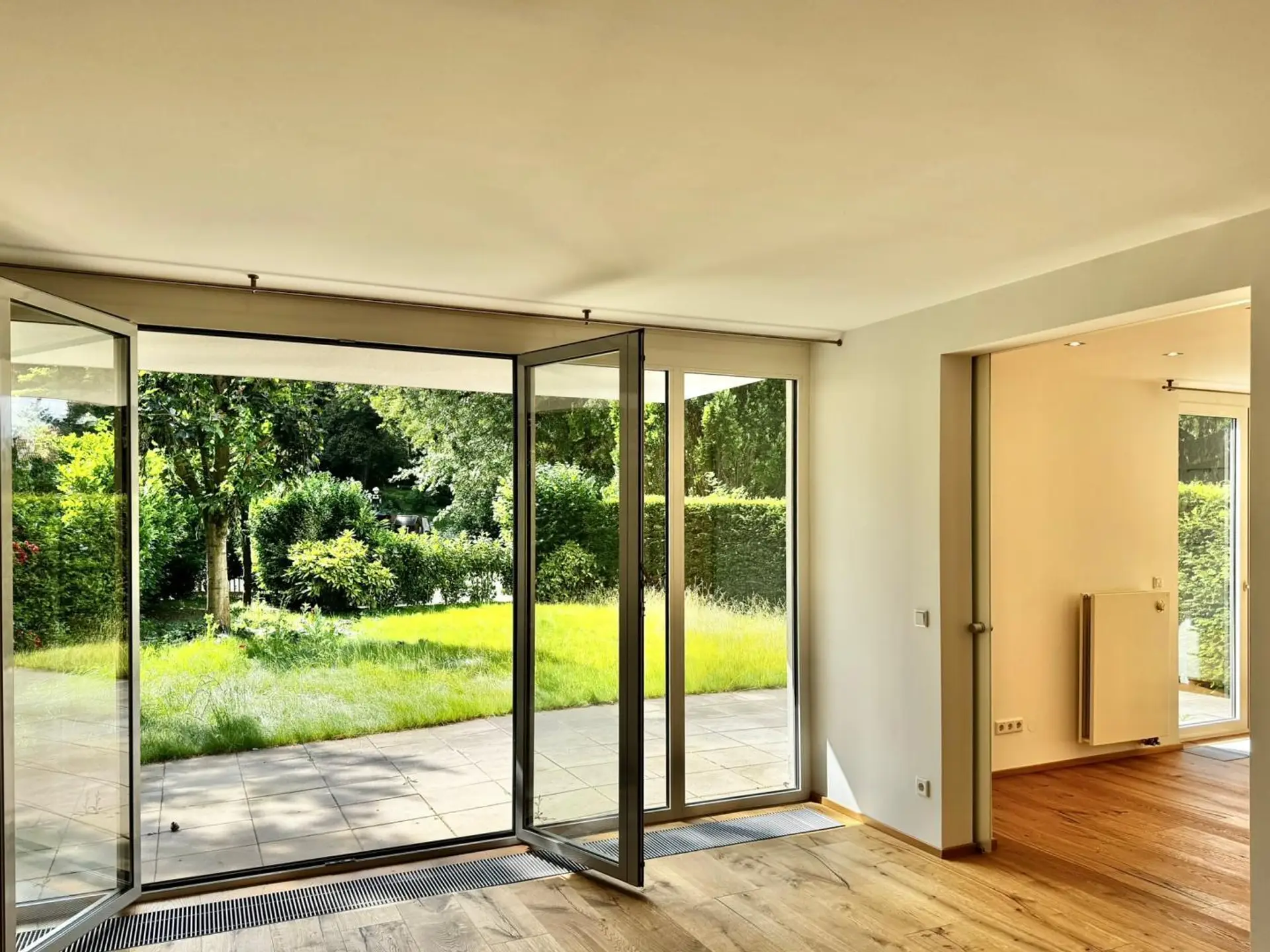 Von hier gelangen wir westseitig durch eine große Flügeltüre auf die etwa 33m² große Terrasse und in den eigenen Garten. Hier kann man nach der Arbeit die Seele baumeln lassen, oder an freien Tagen die Ruhe der Gegend genießen.