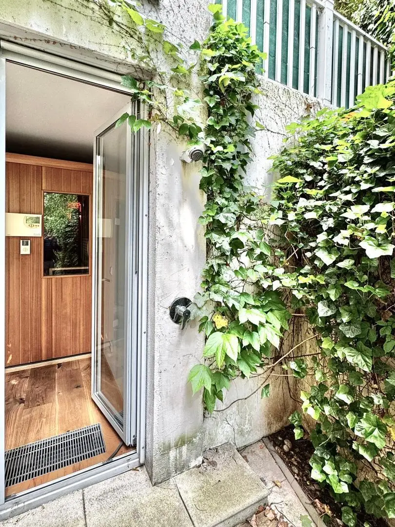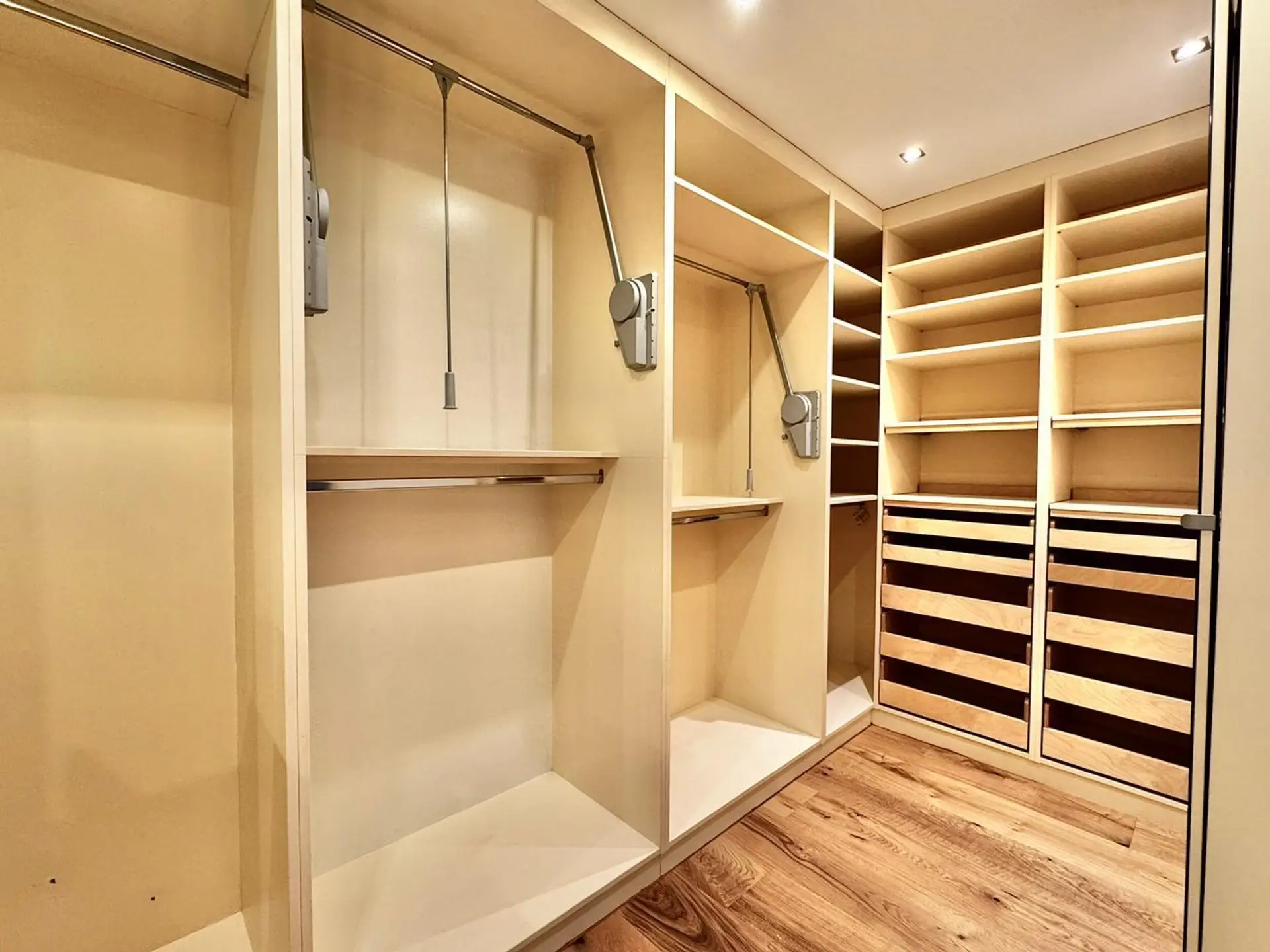 Im, dem Wohnraum gegenüberliegenden Trakt der Wohnung betreten wir den privaten Bereich. Das große Schlafzimmer, das nicht nur durch seine Ruhe, sondern auch durch seine Größe besticht ist auf der linken hinteren Seite mit einem eingerichteten praktischen Ankleideraum verbunden. Auf der rechten Seite befindet sich das zu diesem Zimmer gehörende Badezimmer mit Dusche, Doppelwaschbecken, Bidet und Toilette. Das Highlight ist aber die im Raum befindliche hochwertige Sauna mit Blick auf den seitlichen Teil des Gartens. Natürlich kann man auch von hier in den Garten gelangen. Nicht nur das - gleich an der Hauswand ist eine Dusche im Freien angebracht, hier kann man herrlich das kalte Wasser nach dem Saunagang an uneinsehbarer Stelle genießen.