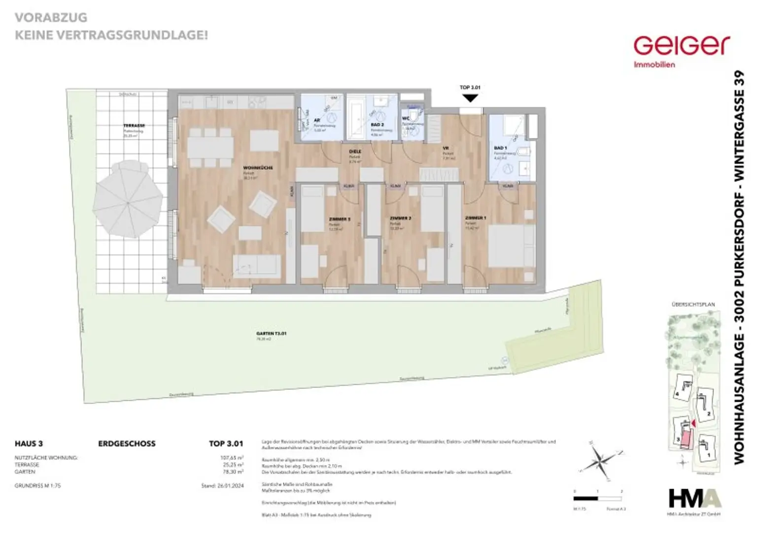 In der zentrumsnahen Wintergasse 39 im beliebten Purkersdorf, errichten wir eine moderne Wohnhausanlage. Diese fügt sich harmonisch in den Hang ein, besteht aus 4 Wohnhäusern mit insgesamt 48 Wohnungen (2-, 3-, 4- und 5-Zimmer Wohnungen), 74 KFZ-Tiefgaragenplätzen, sowie 8 Stellplätzen für Motorräder.