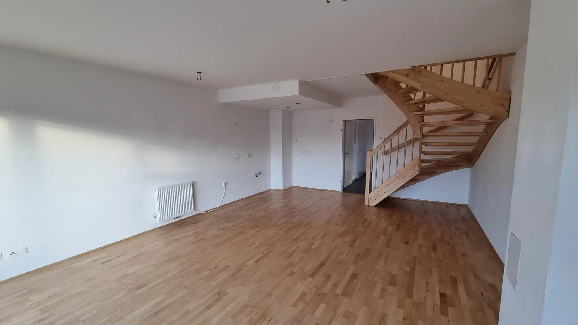 Die schöne 4 Zimmer Maisonettewohnung im Dachgeschoss bietet knapp 95m² Wohnfläche und eine Dachterrasse mit ca. 9m², aufgeteilt auf 2 Ebenen. Im 1. Obergeschoss befinden sich ein Vorzimmer, ein WC, ein Abstellraum und ein geräumiges Wohnzimmer mit optimal integrierter Kochnische. Vom Wohnzimmer gelangt man direkt auf die herrliche Dachterrasse.