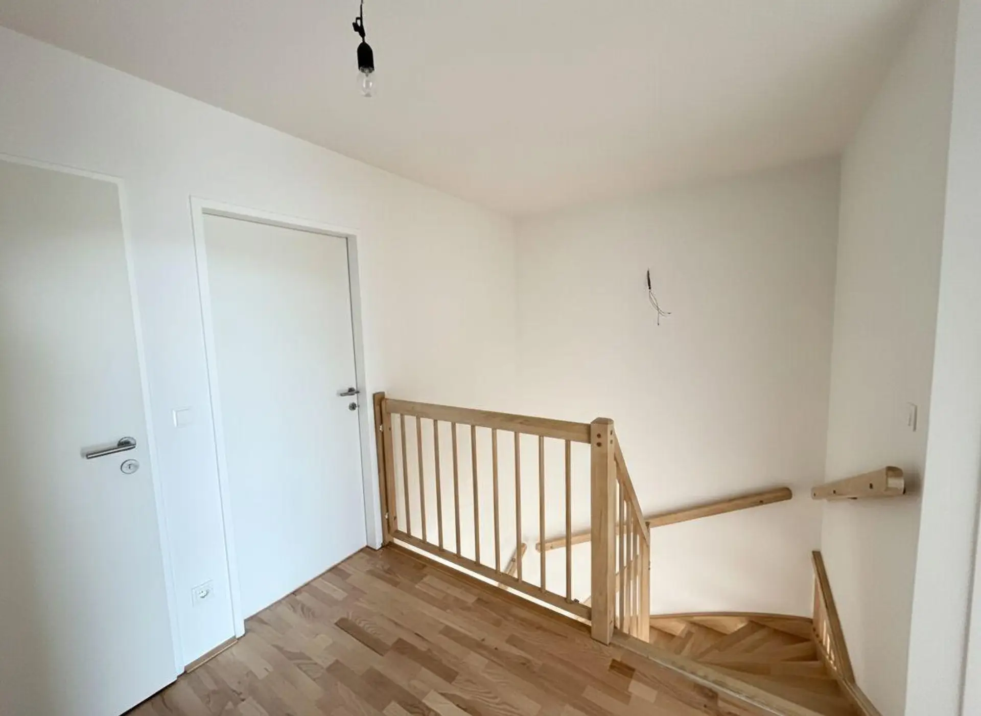 Über die Holztreppe im Wohnzimmer (ein Blickfang) erreicht man das Dachgeschoß.