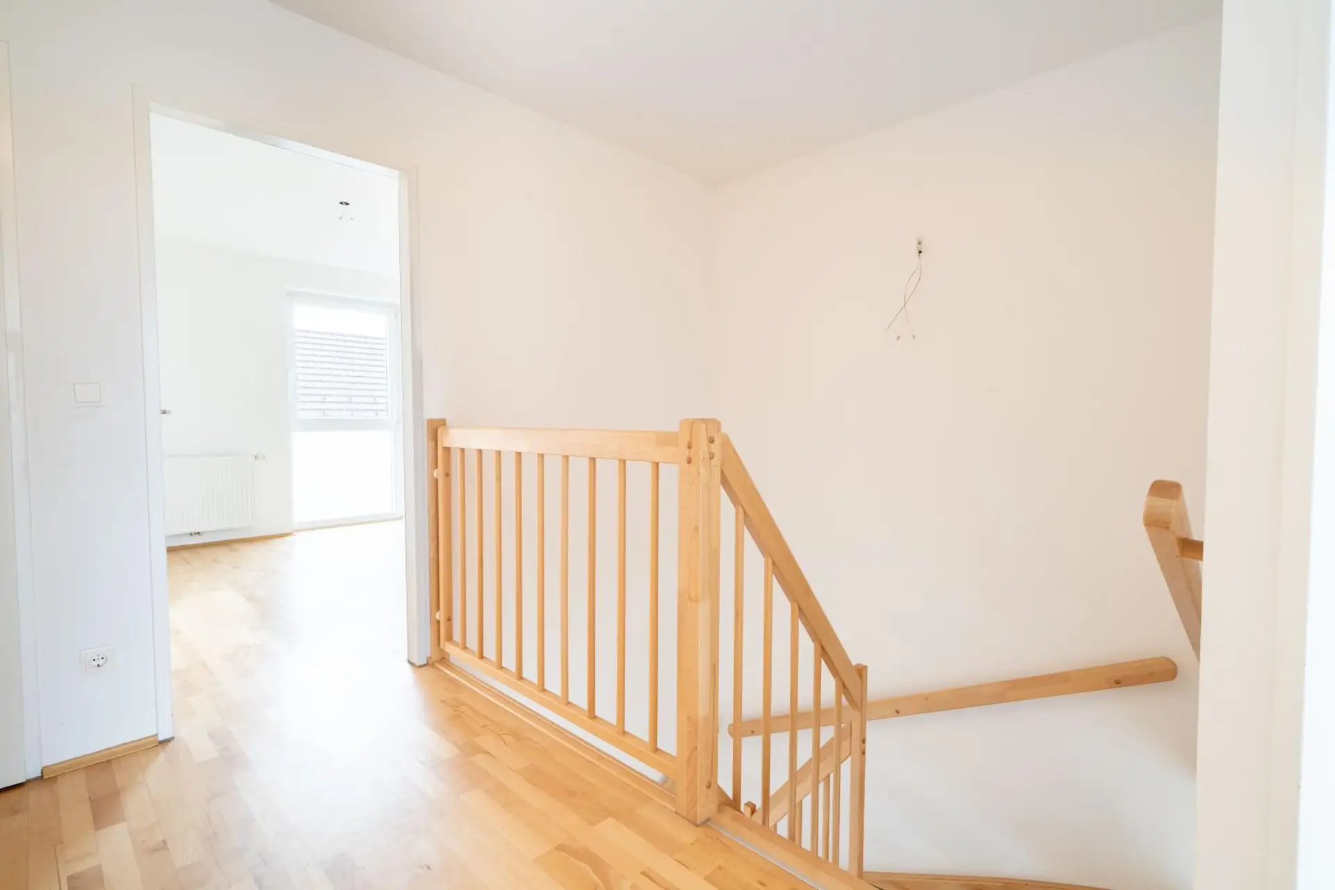 Über die Holztreppe im Wohnzimmer (ein Blickfang) erreicht man das Dachgeschoß.