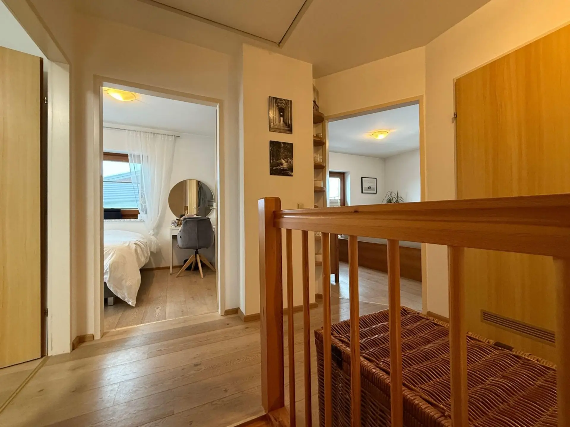 OG: Vom zentralen Flur erreichen Sie die drei Schlafzimmer (eines davon wird derzeit als Büro genutzt), ein WC sowie das ausgestattete Badezimmer mit Dusche und Eckbadewanne. Vom Eltern- und einem Kinderzimmer gelangen Sie auf den ca. 20m² großen umlaufenden nach Süden ausgerichteten Balkon.