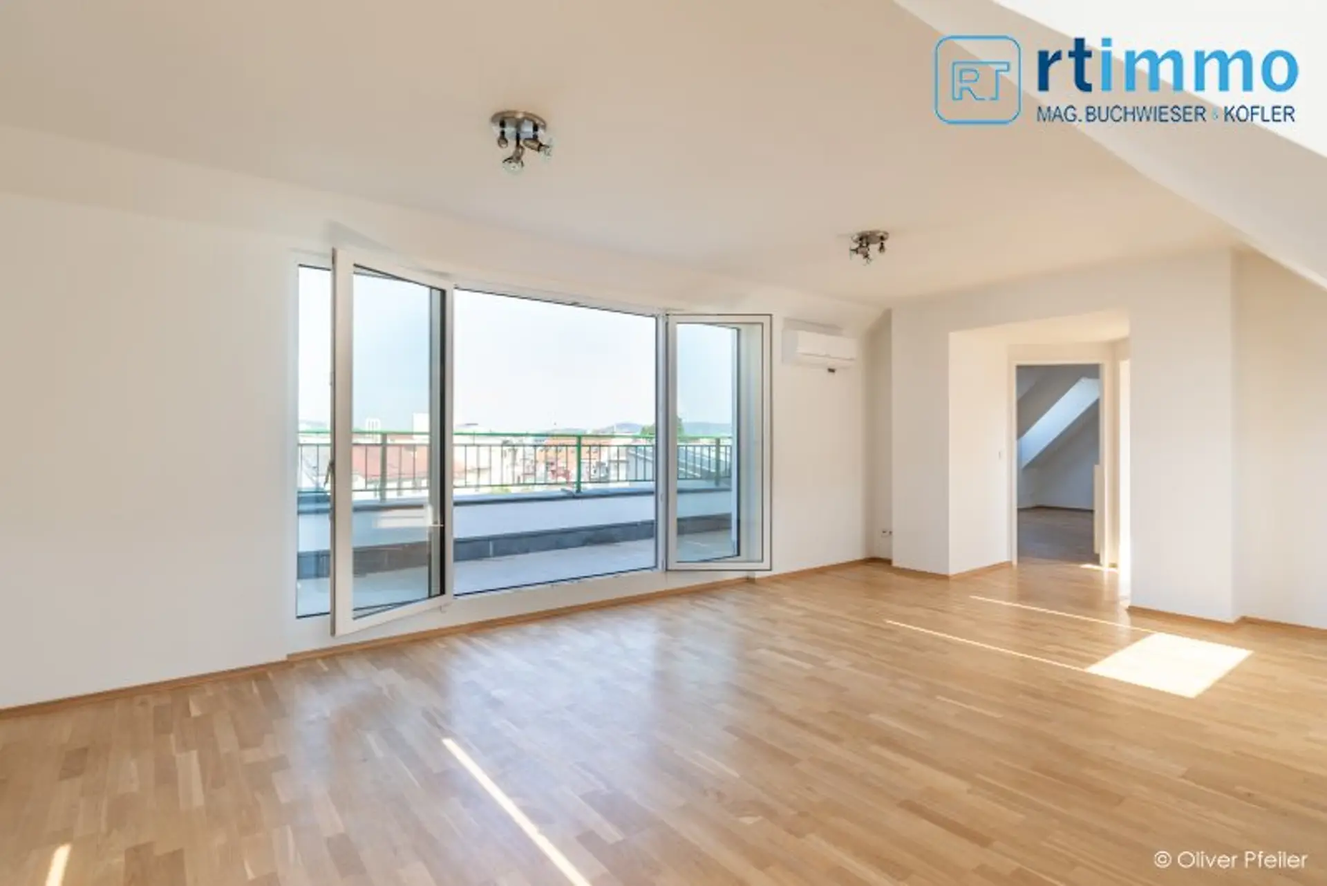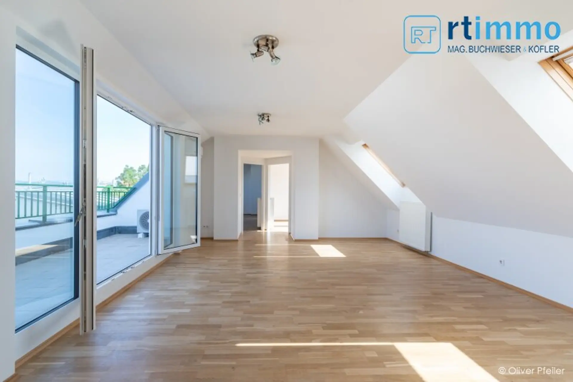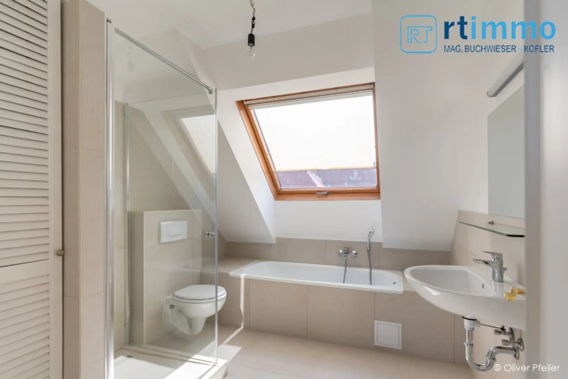 Die Wohnung wird beidseitig belichtet und hat Schrägen mit hohem Kniestock. Die Glastüren zur Terrasse im Wohnzimmer können zu Gänze geöffnet werden (faltbar), sodaß im Sommer die Terrasse als erweitertes Wohnzimmer genutzt werden kann. Jedes der 3 Schlafzimmer verfügt über ein eigenes Bad, davon 2 Wannenbäder mit Dusche und WC, eines nur mit Dusche. Sämtliche Dachschrägenfenster verfügen über innenliegenden Sonnenschutz und die Terrassentüren über Jalousien.
