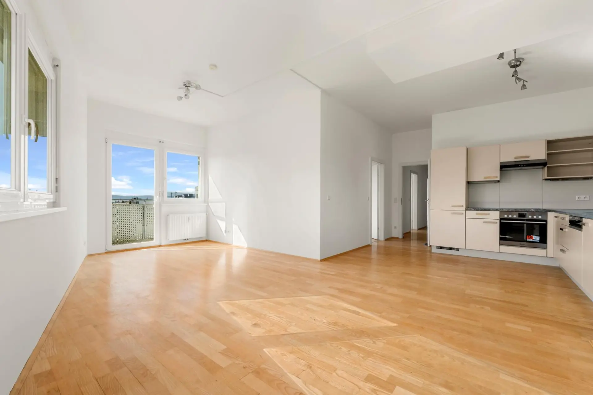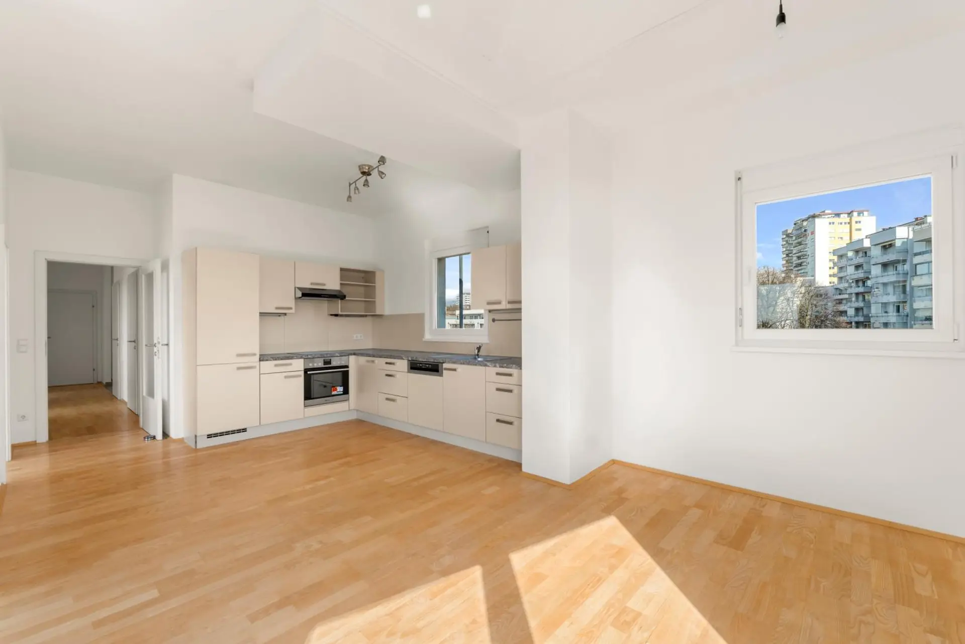 Das Herzstück der Wohnung bildet die helle Wohnküche, die dank ihrer Ausrichtung ganztägig von Sonnenlicht durchflutet wird. Die Küche ist mit komplett neuen, unbenutzten Geräten ausgestattet und bietet modernen Wohnkomfort auf aktuellem Stand.