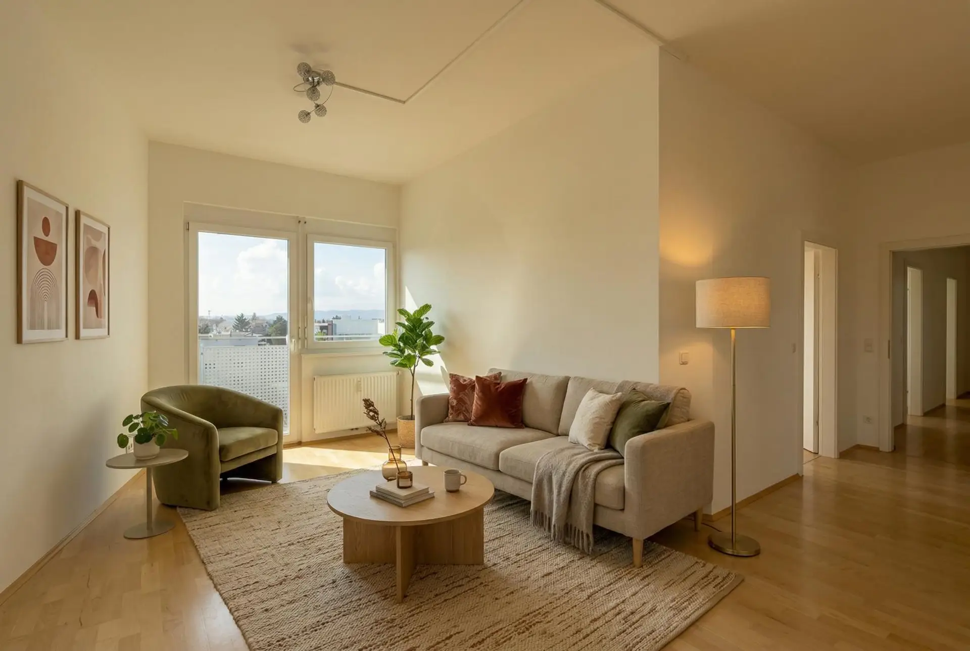 Ein einladender Vorraum mit ausreichend Platz für eine Garderobenlösung schafft einen angenehmen Empfangsbereich. Ein zusätzlicher Abstellraum sorgt für praktischen Stauraum im Alltag. Insgesamt stehen drei Schlafzimmer zur Verfügung, wodurch die Wohnung ideal für Familien mit Kindern oder für die Kombination aus Wohnen und Homeoffice geeignet ist.