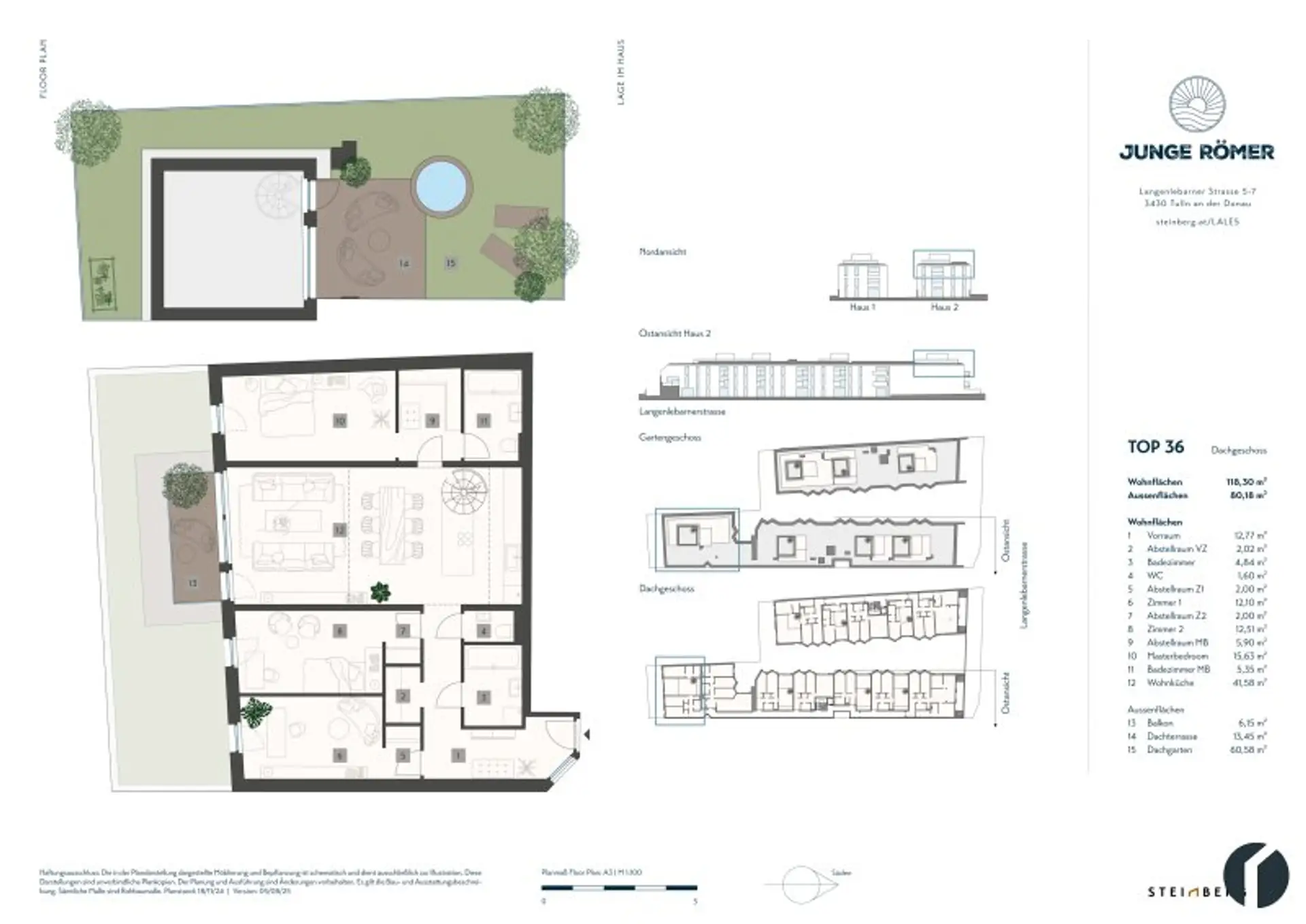 Top 36 ist eine Dachgeschosswohnung in hofseitiger Lage und bietet Ihnen auf ca. 118,30m² Wohnfläche ein Wohnzimmer mit Anschlüssen für eine offene Küche, 3 Schlafzimmer, ein Badezimmer mit Badewanne, Waschbecken und Waschmaschinenanschluß und ein weiteres Badezimmer mit Badewanne, Waschbecken und WC. Ein separates WC mit Handwaschbecken sowie 4 Abstellräume. Die Außenfläche umfasst einen ca. 60,58m² großen Dachgarten (Ausführung in Kunstrasen), eine ca. 13,45m² große Dachterrasse sowie einen ca. 6,15m² großen Balkon.