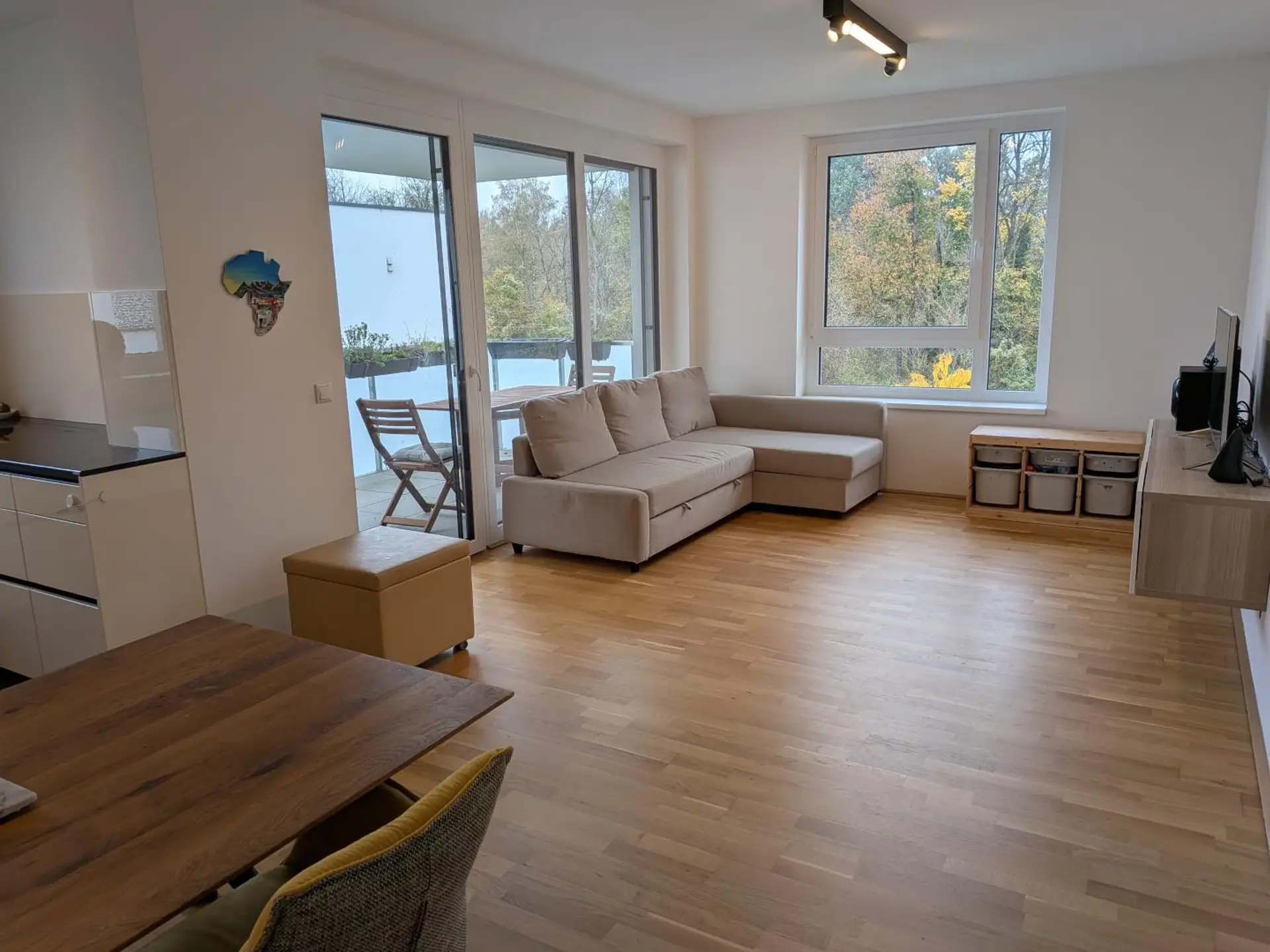 Sie verfügt über eine moderne Wohnküche mit Einbauküche und offenem Wohnbereich. Von hier aus gelangt man auf die Loggia mit Blick ins Grüne.