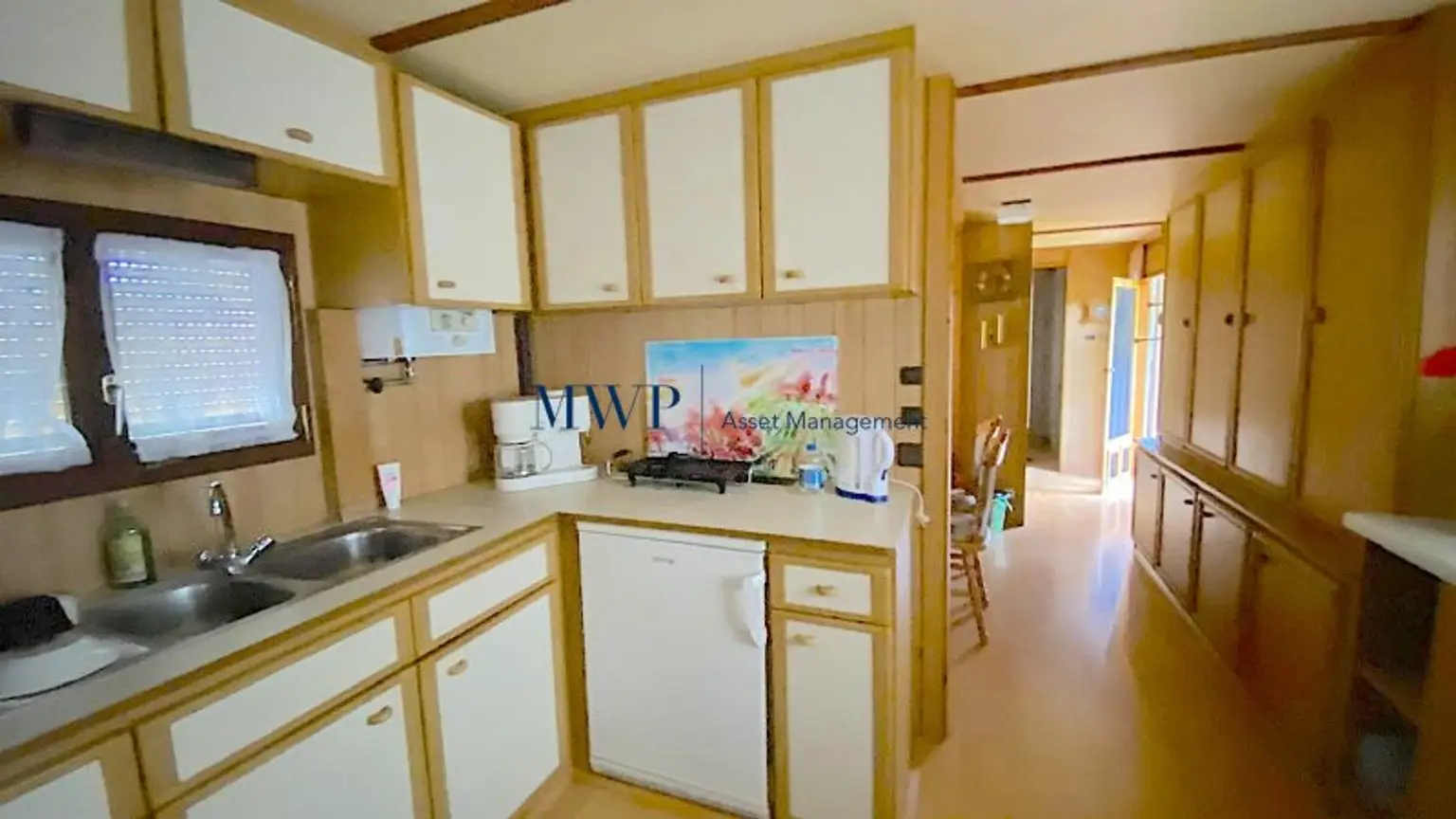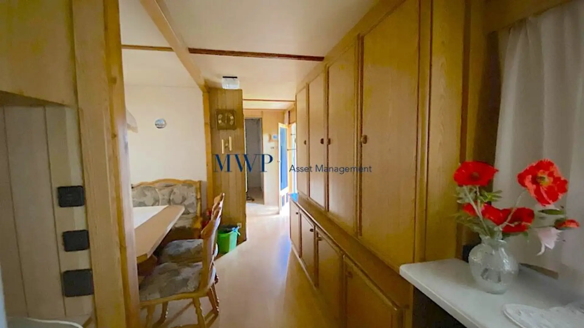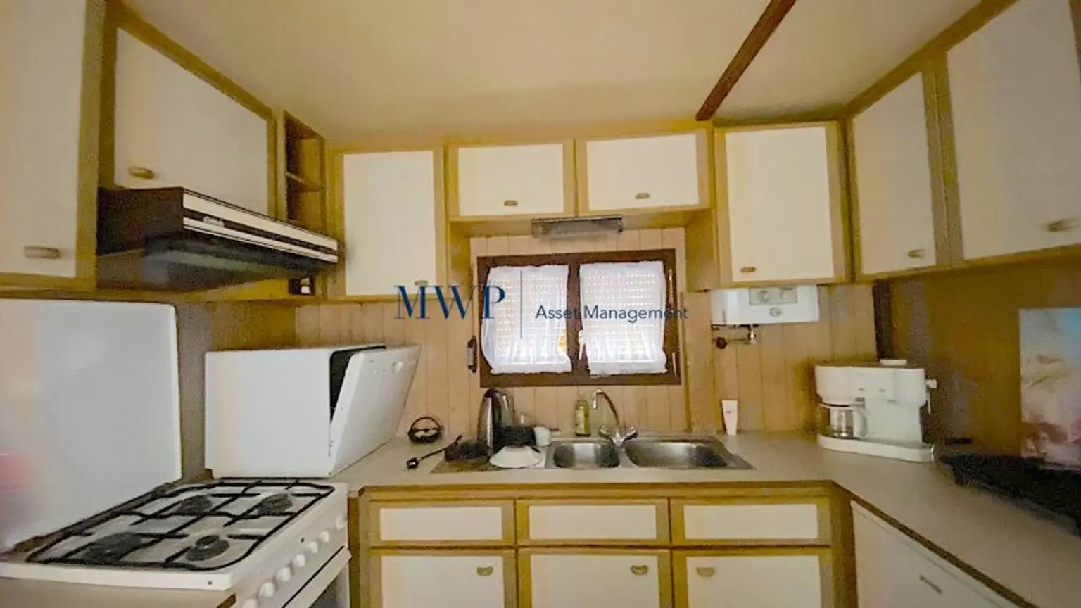 Das stilvolle, französische Holzmobilhaus überzeugt mit einer Wohnfläche von ca. 40 m² und einer durchdachten Raumaufteilung: Vorzimmer, gemütliches Wohnzimmer, Küche mit Essbereich sowie ein Schlafzimmer bieten alles, was man für entspannte Tage am See benötigt. Die Immobilie wird vollständig möbliert übergeben – inklusive Einbauküche, Holzschränken, Betten und einer eleganten Glasvitrine. Ein Badezimmer mit Dusche und WC ist ebenfalls vorhanden.