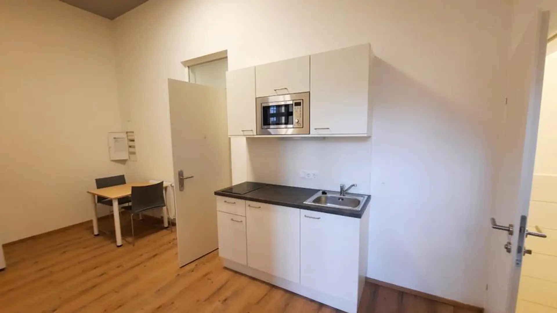 Küchenzeile mit Ober- und Unterschränken: Cerankochfeld mit 2 Kochzonen, Mikrowelle mit Grillfunktion, Kühlschrank mit Gefrierkombination, Integrierte Arbeitsflächenbeleuchtung und Spüle mit darunterliegendem Müllauszug