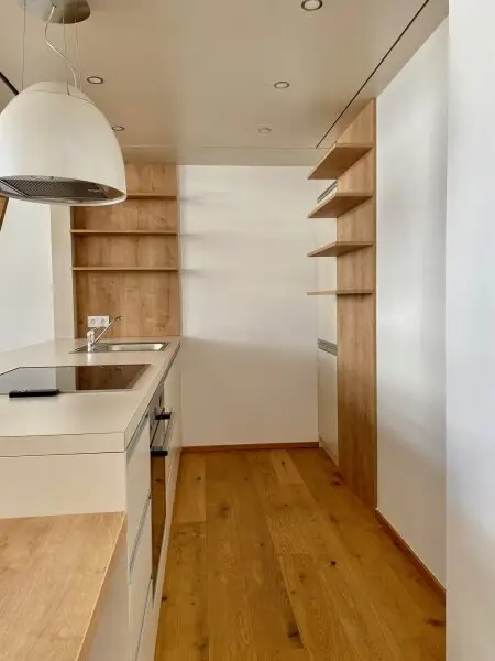 Der offene Grundriss schafft ein großzügiges Raumgefühl, und hochwertige Fliesen und Parkettböden verleihen der Wohnung einen eleganten, natürlichen Look. Die absolut einzigartige Einbauküche mit allen notwendigen Geräten macht das Kochen zum Vergnügen, und die Wohnküche ist ideal, um mit Freunden und Familie zu speisen und zu entspannen.