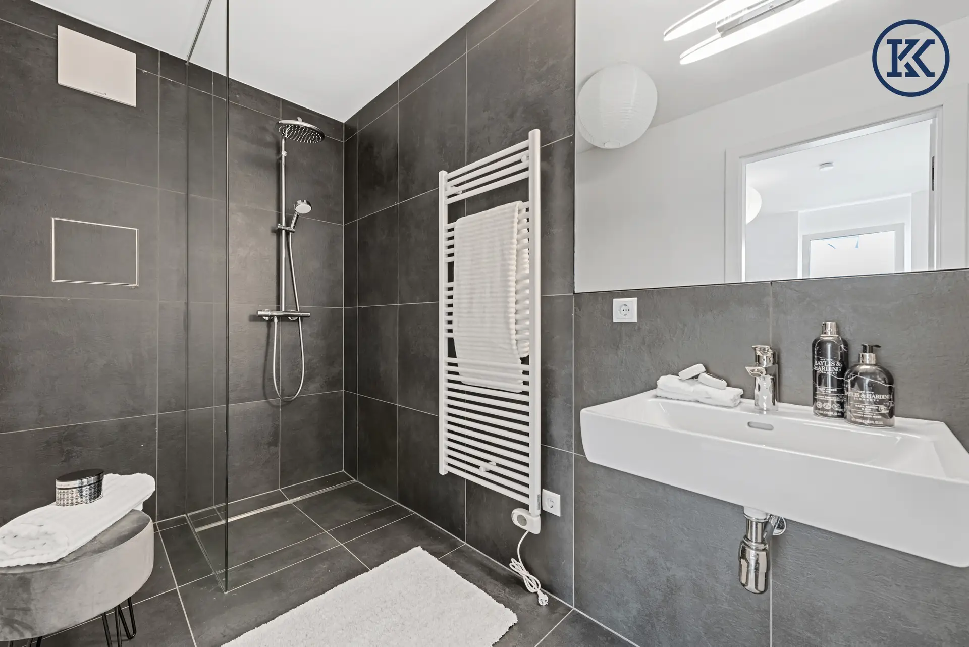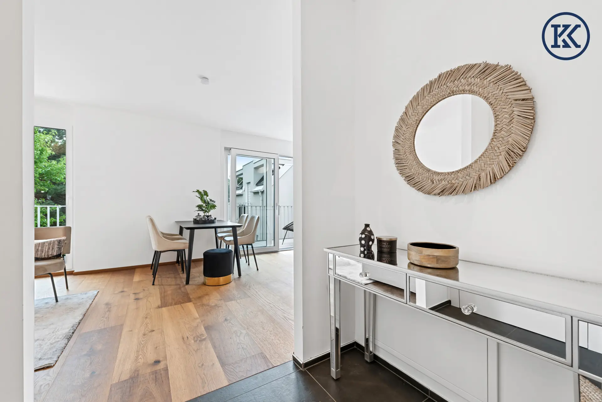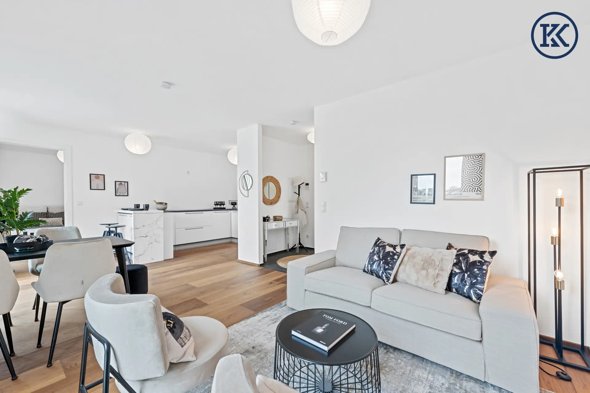 Hochwertiges Wohnen: Die Wohnung überzeugt durch eine Premium-Ausstattung mit gebürstetem Eichenparkett in den Wohnräumen. Die Sanitärbereiche sind mit edlem Feinsteinzeug und Qualitätsarmaturen versehen.