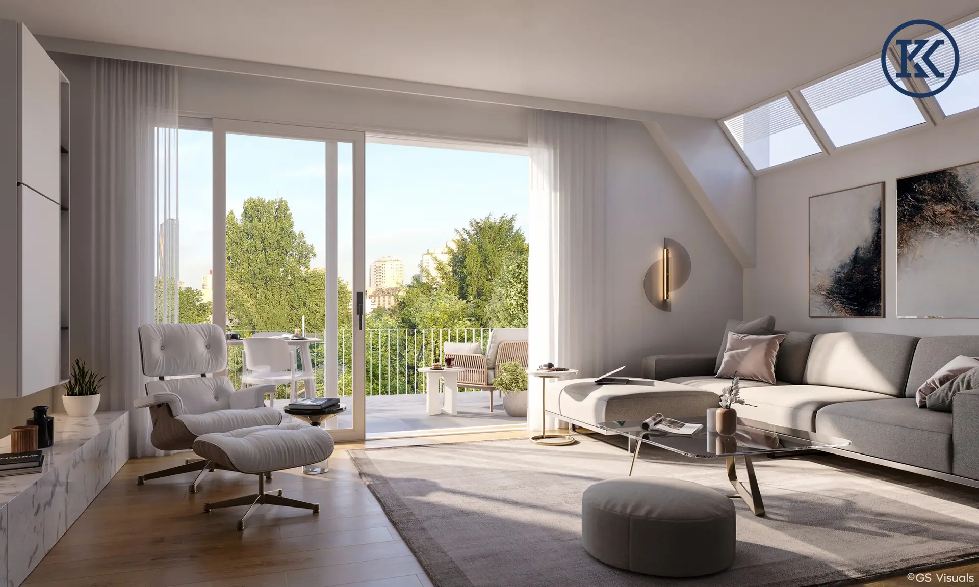 Komfortmerkmale: Große, dreifach-verglaste Fenster mit elektrischem Außensonnenschutz sowie extra-hohe Türen (2,10 m) bieten höchsten Wohnkomfort.