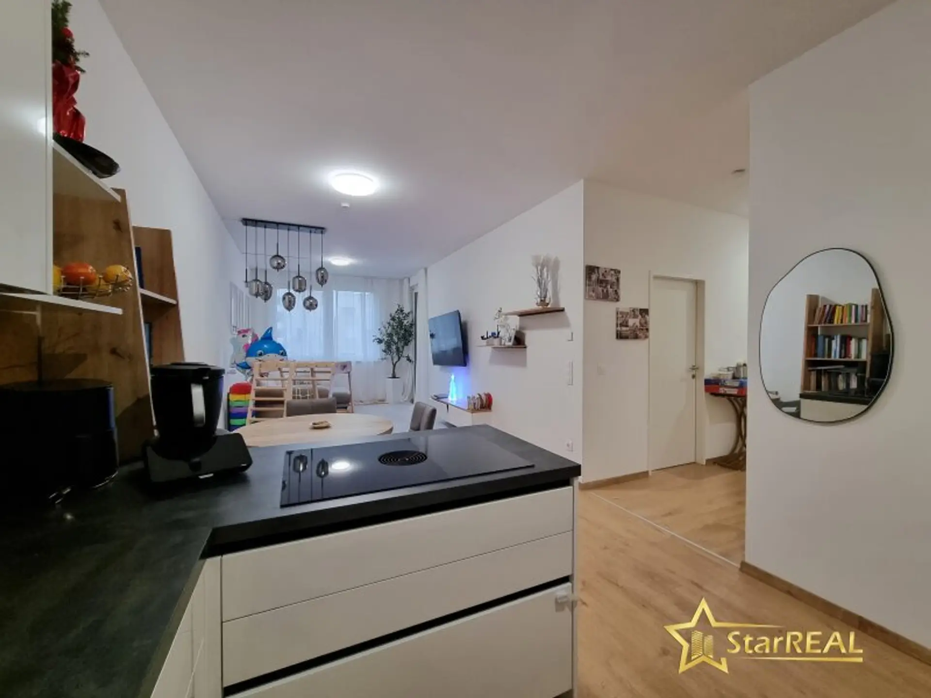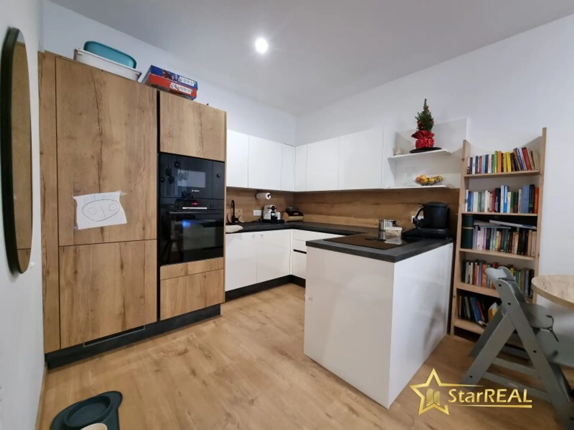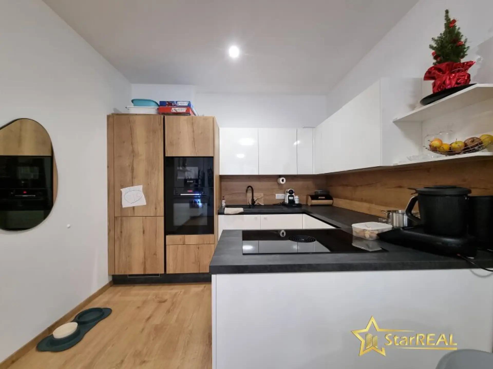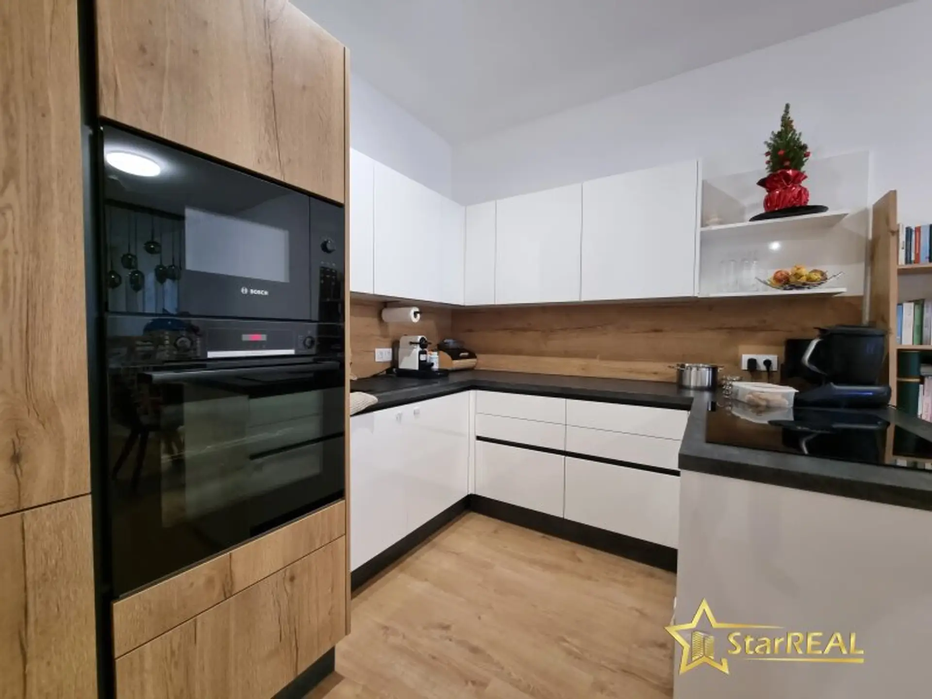 BORA Cerankochfeld mit integriertem Dunstabzug, Backrohr, Einbaukühl- und Gefrierschrank, Mikrowelle, Spüle und Geschirrspüler. Es befinden sich hochwertige Tischlereinbaukästen in der Wohnung welche im Kaufpreis enthalten sind. Die Wohnung wird teilmöbliert übergeben. (Einbaukästen, Küche, Bad und WC)