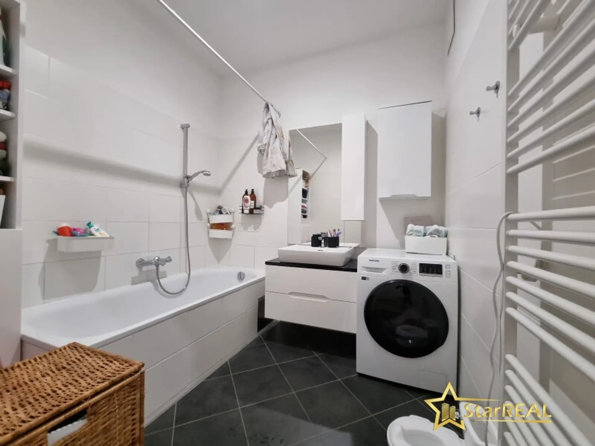 Die Wohnung ist mit hochwertigen Materialien ausgestattet: elegante Fliesen in Bad und WC sowie stilvolles Laminat in den Wohnräumen. Das Badezimmer bietet eine Badewanne, modernen Waschtisch, Handtuchheizkörper und einen Waschmaschinenanschluss.