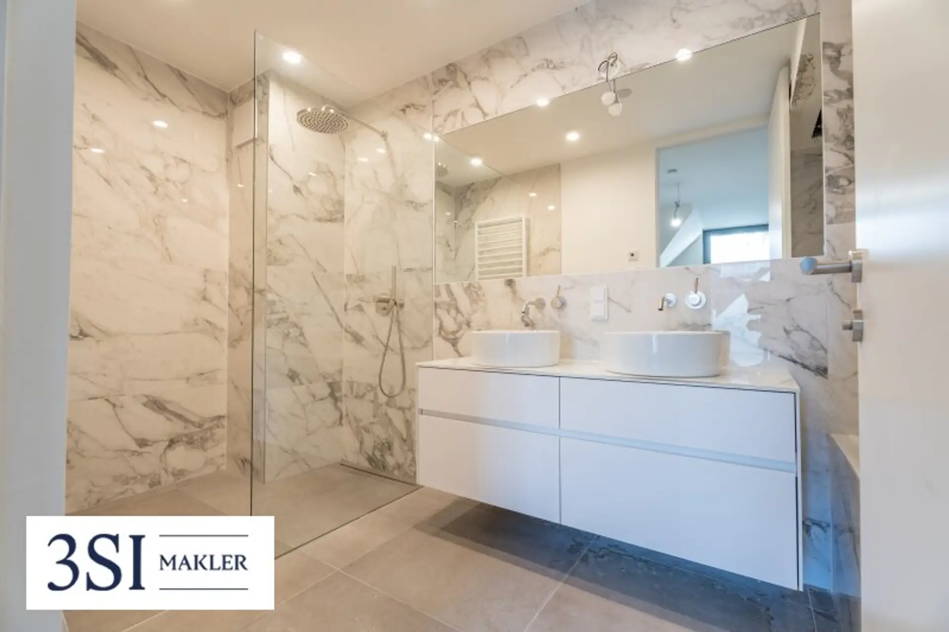 * Badezimmer mit Badewanne, Dusche und zwei Handwaschbecken (ca. 7 m²)