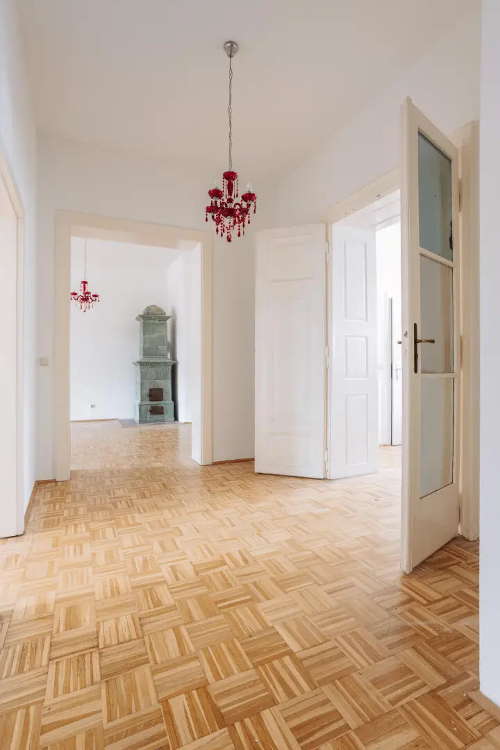 Die Wohnung gliedert sich in einen Vorraum, ein Wohnzimmer mit antikem Kachelofen, zwei Schlafzimmer, einen Abstellraum, eine Küche, ein Badezimmer sowie eine separate Toilette.