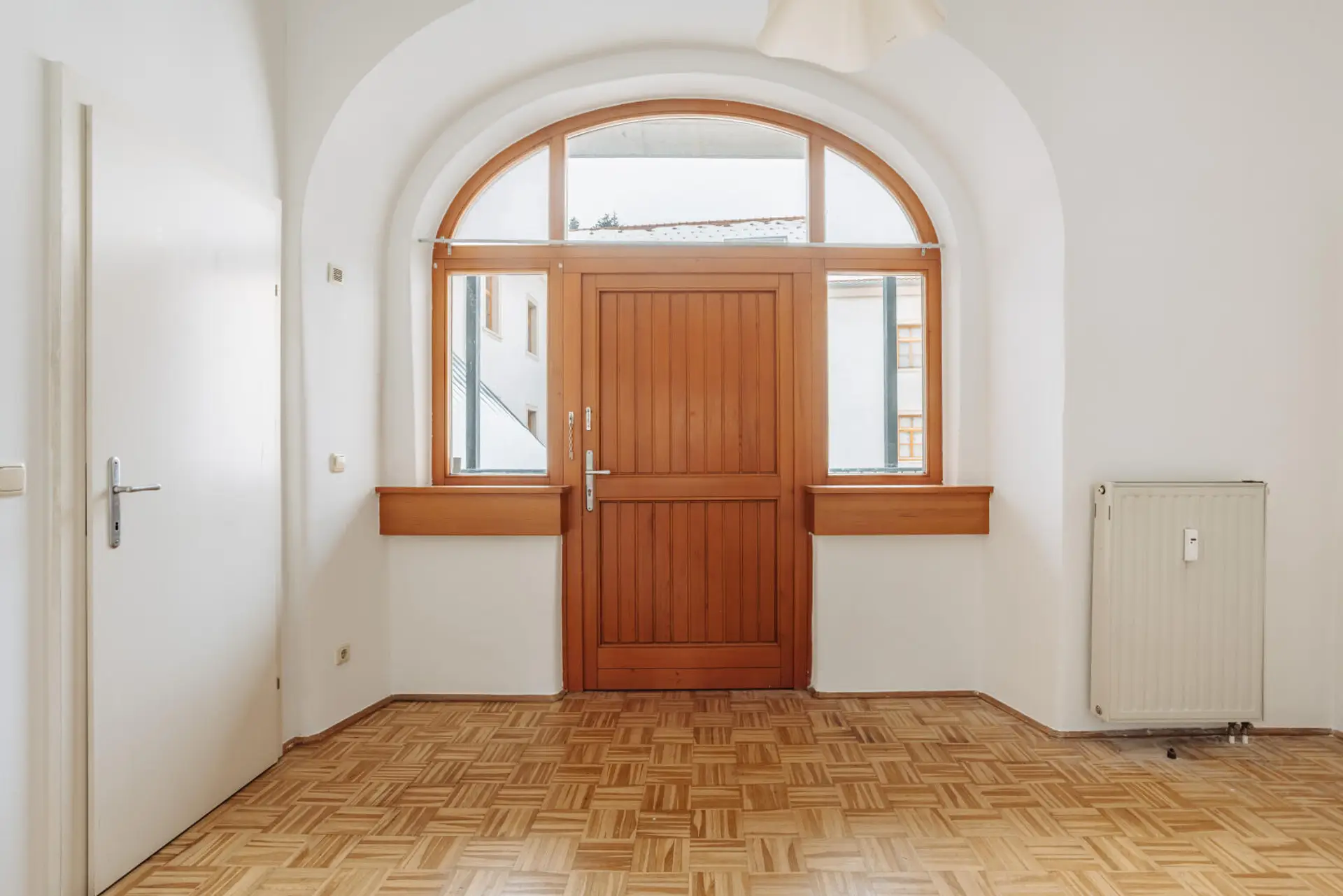 Der großzügige Eingangsbereich liegt am Innenbalkon mit Blick in den malerischen, ruhigen Innenhof und ist bequem mit dem Lift erreichbar.