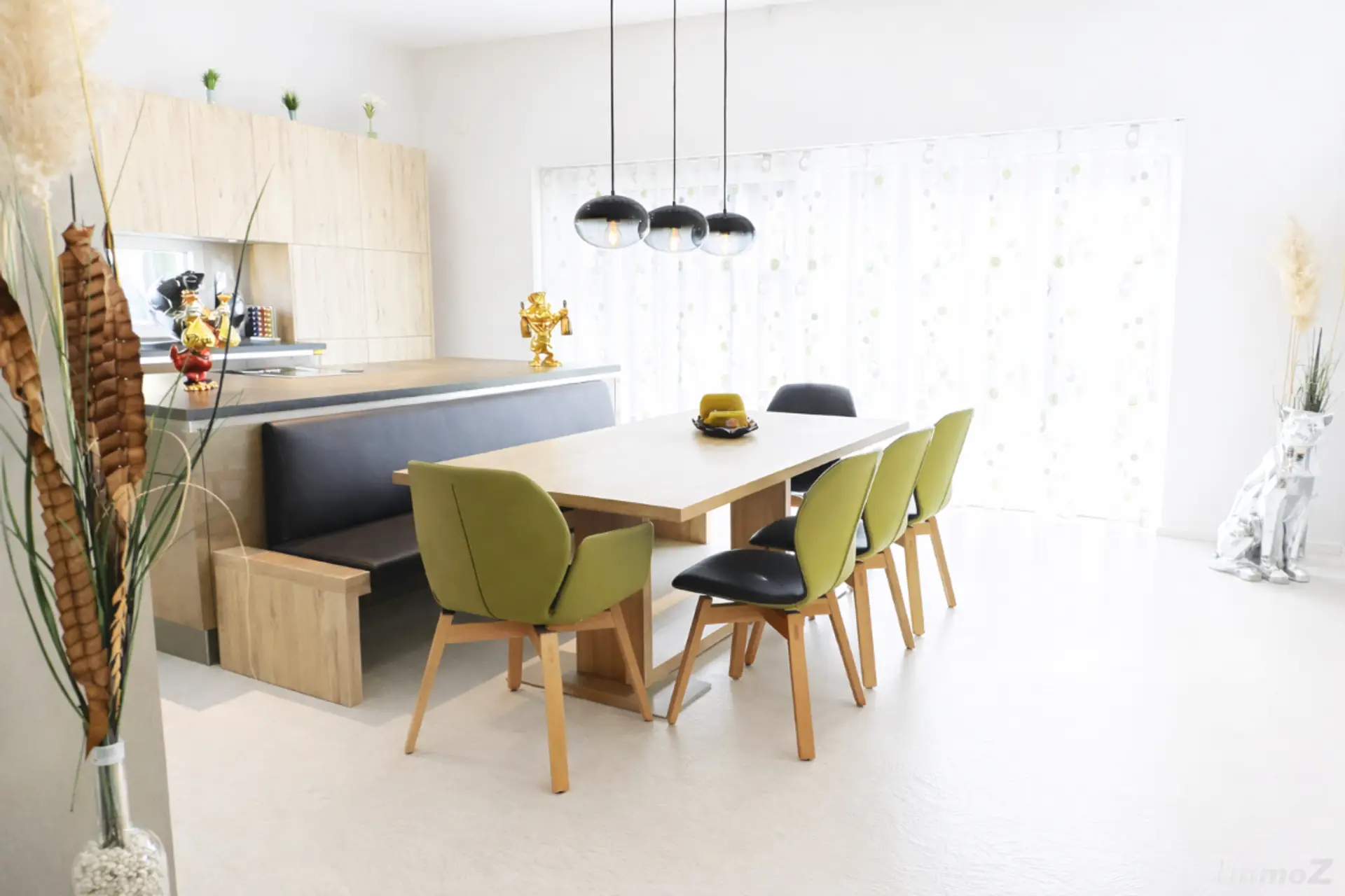 Vom offenen Ess-Wohnraum mit einer hochwertigen Neubauer-Tischlerküche gelangt man auf die großzügige Sonnenterrasse.