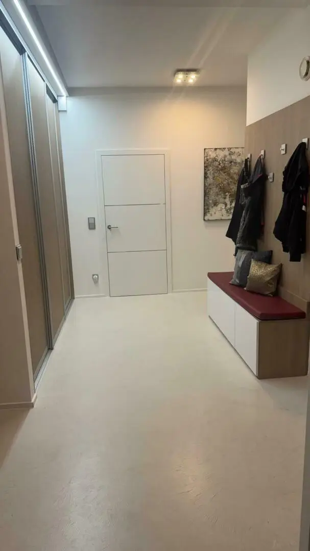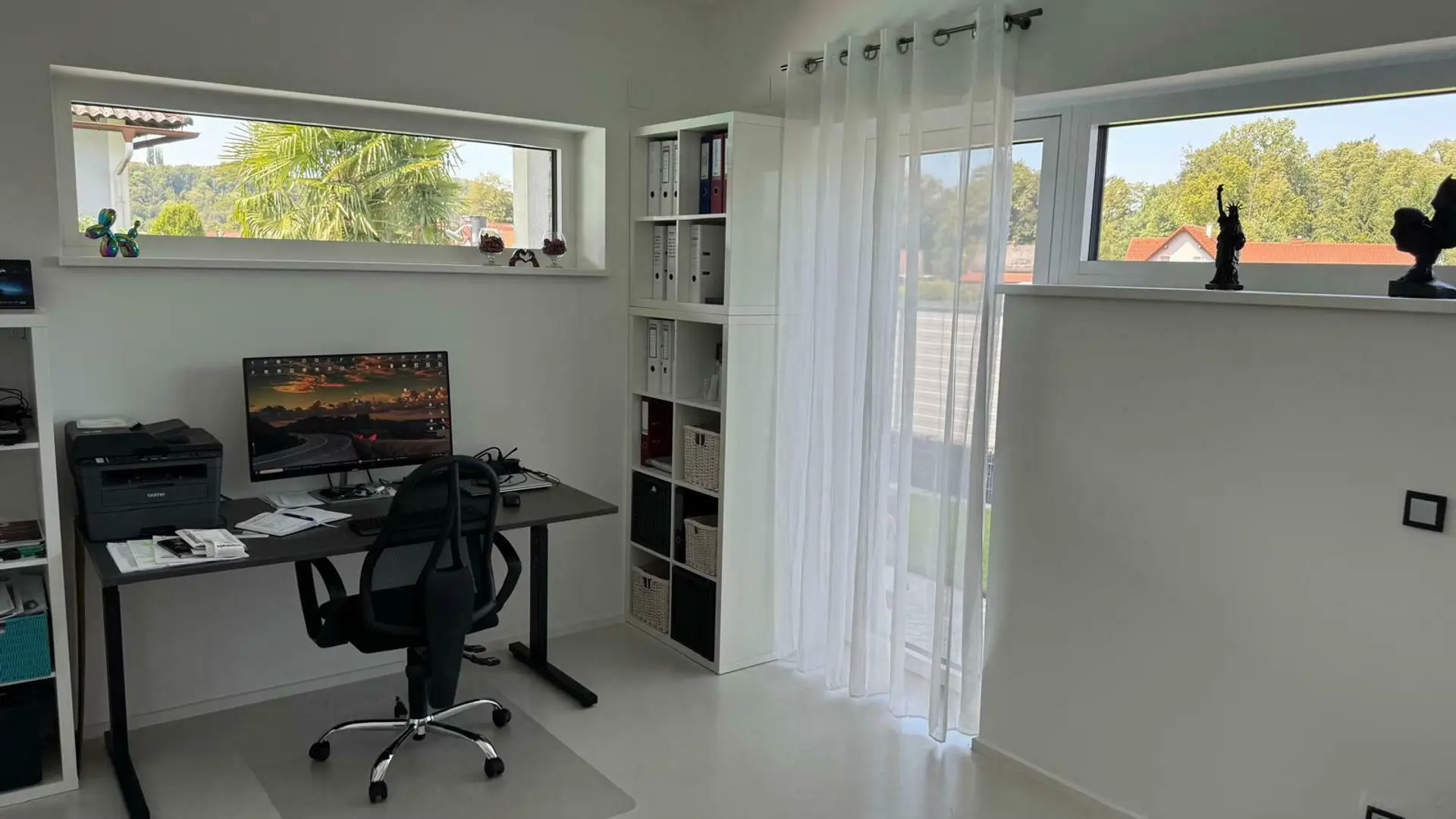 Man betritt das Haus vom überdachtem KFZ-Bereich. Vom Vorraum ausgehend bietet sich bereits der wunderschöne Blick nach Westen Richtung Garten. Das Haus bietet neben dem Privat-Bereich mit Schlafzimmer, Schrankraum und Tageslichtbadezimmer (Dusche und Badewanne) ein weiteres Schlafzimmer bzw. Büro. Vom offenen Ess-Wohnraum mit einer hochwertigen Neubauer-Tischlerküche gelangt man auf die großzügige Sonnenterrasse. Der kombinierte Haushalts-Vorratsraum ist sowohl vom Küchenbereich als auch vom Eingangsbereich betretbar. Weiters findet man ein WC sowie einen Technikraum. Der Boden wurde in einer modernen Betonbeschichtung auf Zementbasis in einer Spachteltechnik ausgeführt.