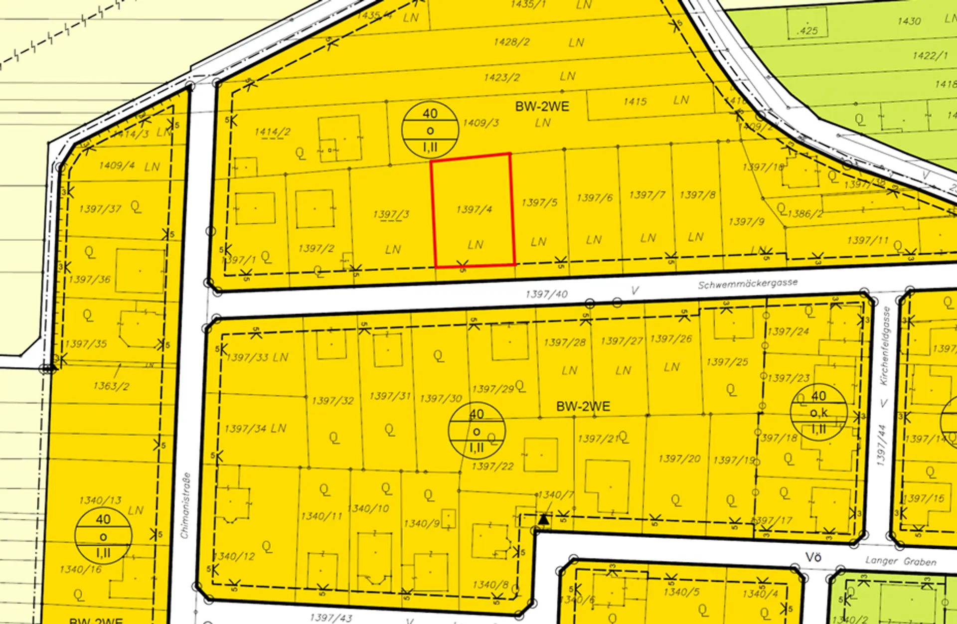 > Widmung: Bauland-Wohngebiet – max. 2 Wohneinheiten (z.B. Doppelhaus + je WE 2 KFZ-Abstellplätze)