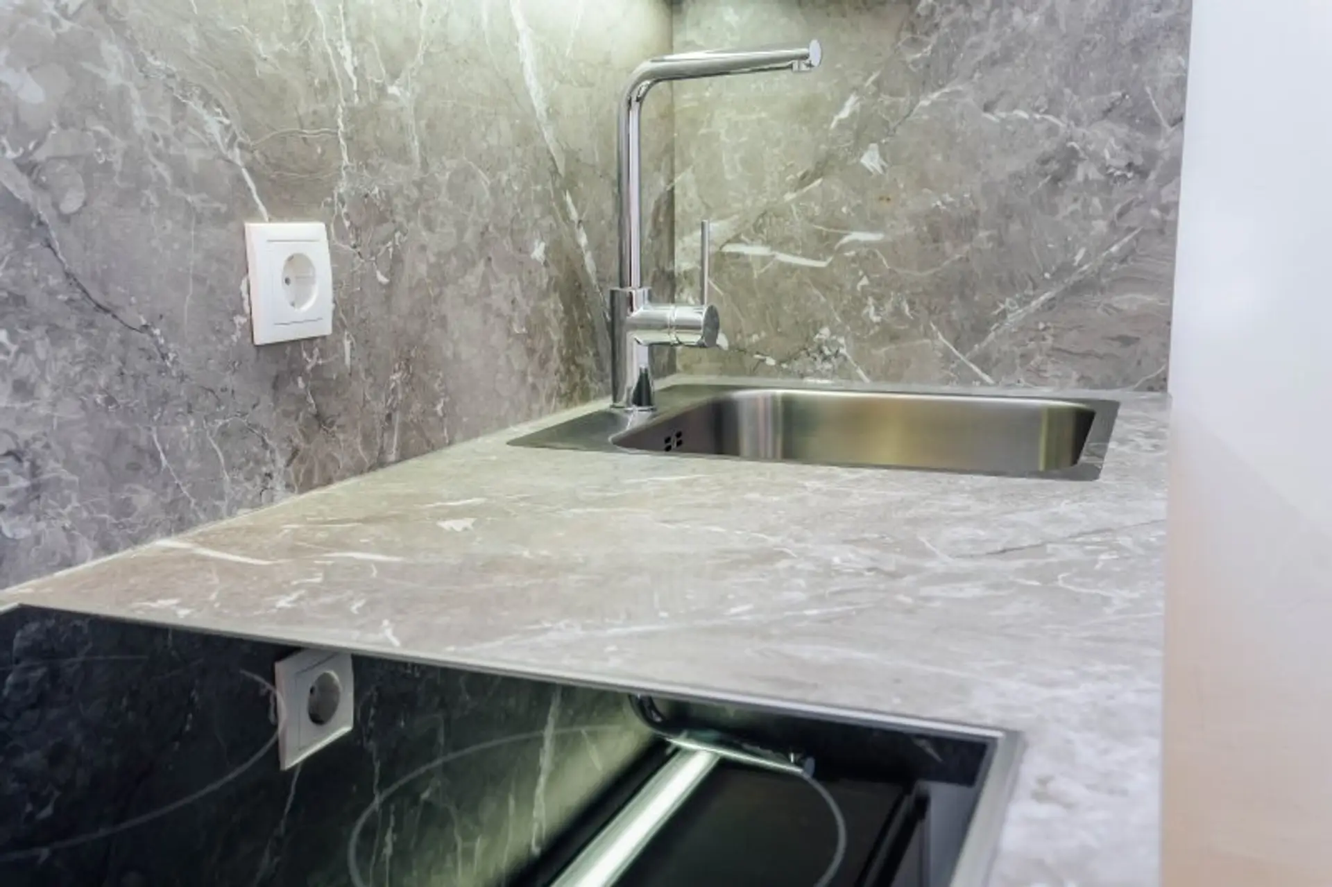 Moderne Küche mit allem Komfort: Kühlschrank, Backrohr, Ceranfeld, Dunstabzug, Spüle, Geschirrspüler und gemütlichem Essbereich