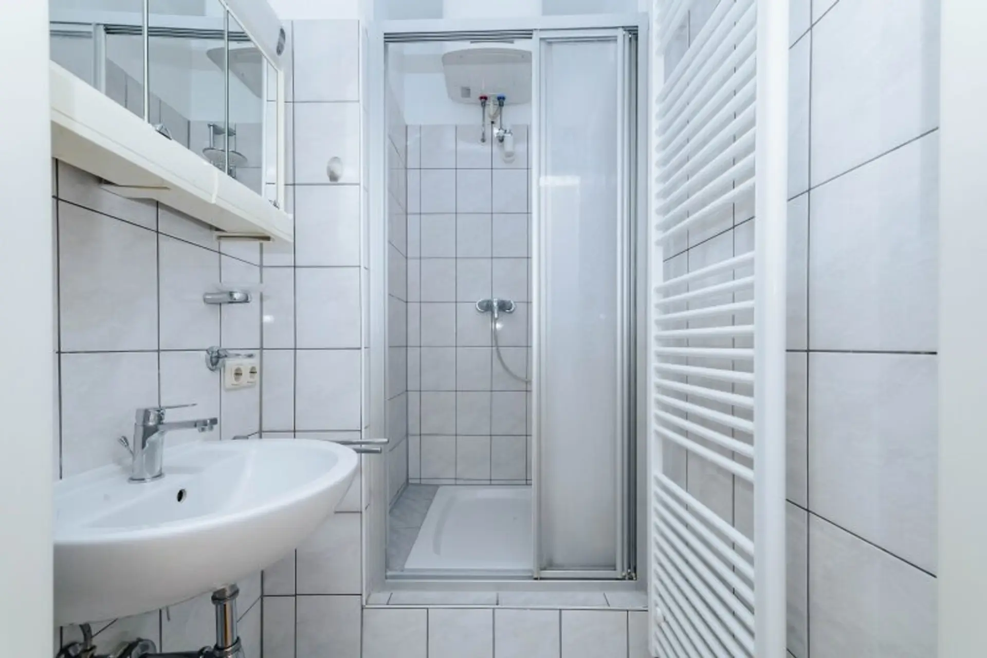 Badezimmer mit Dusche, Waschbecken, Spiegelschrank und Handtuchwärmer – hell und modern gestaltet